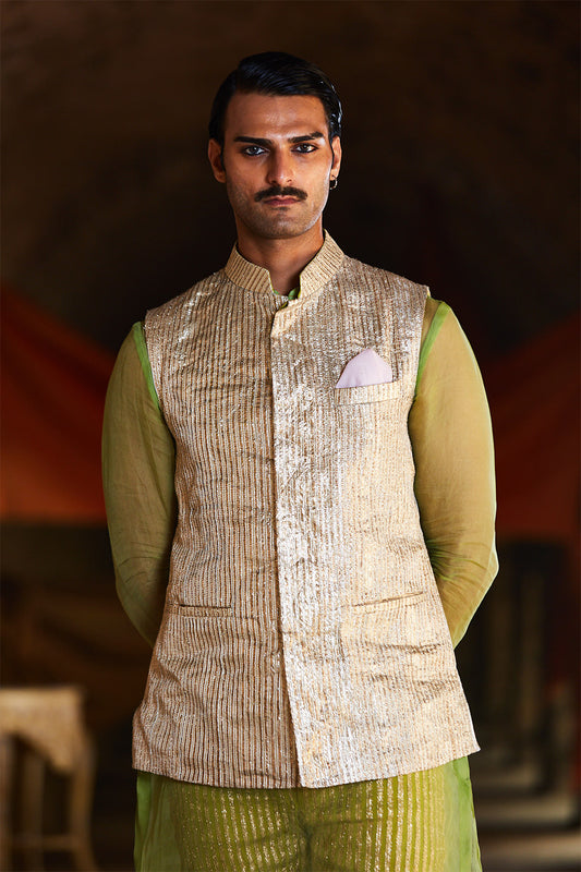 Light Green Linen Kurta With Handmade Lampi Stripes