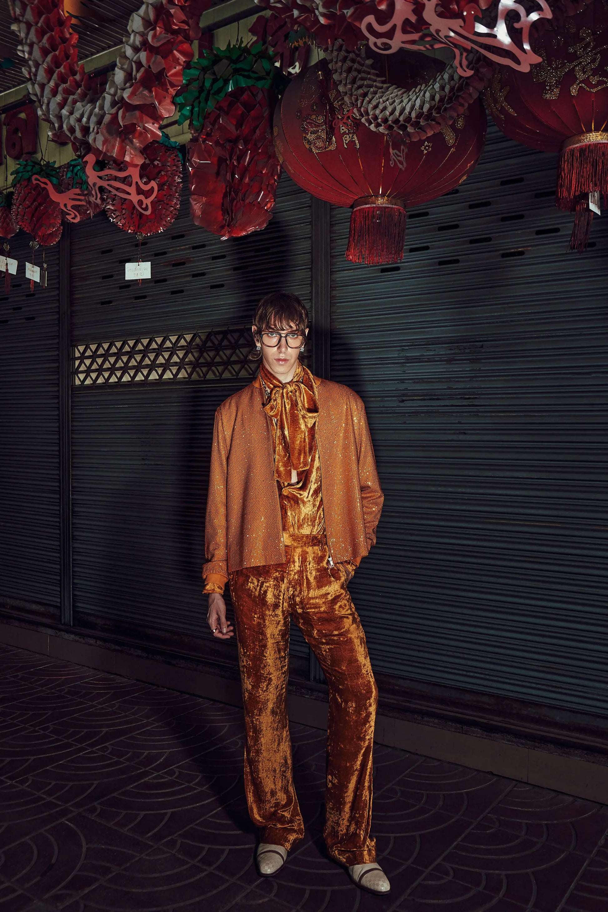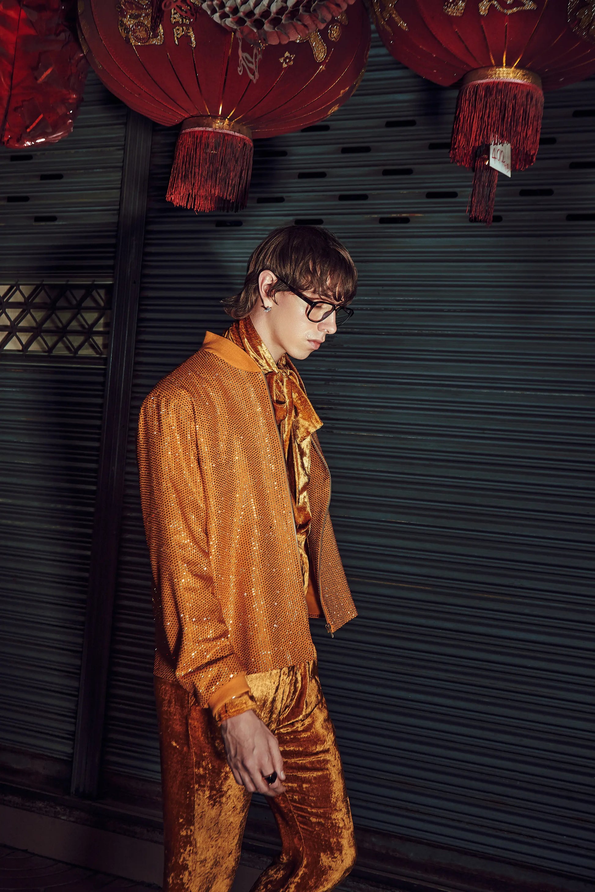 This set includes a mustard bomber jacket in melon crepe and a matching velvet coord set.