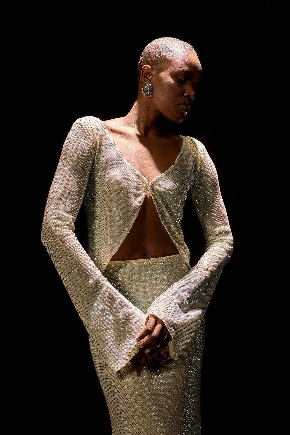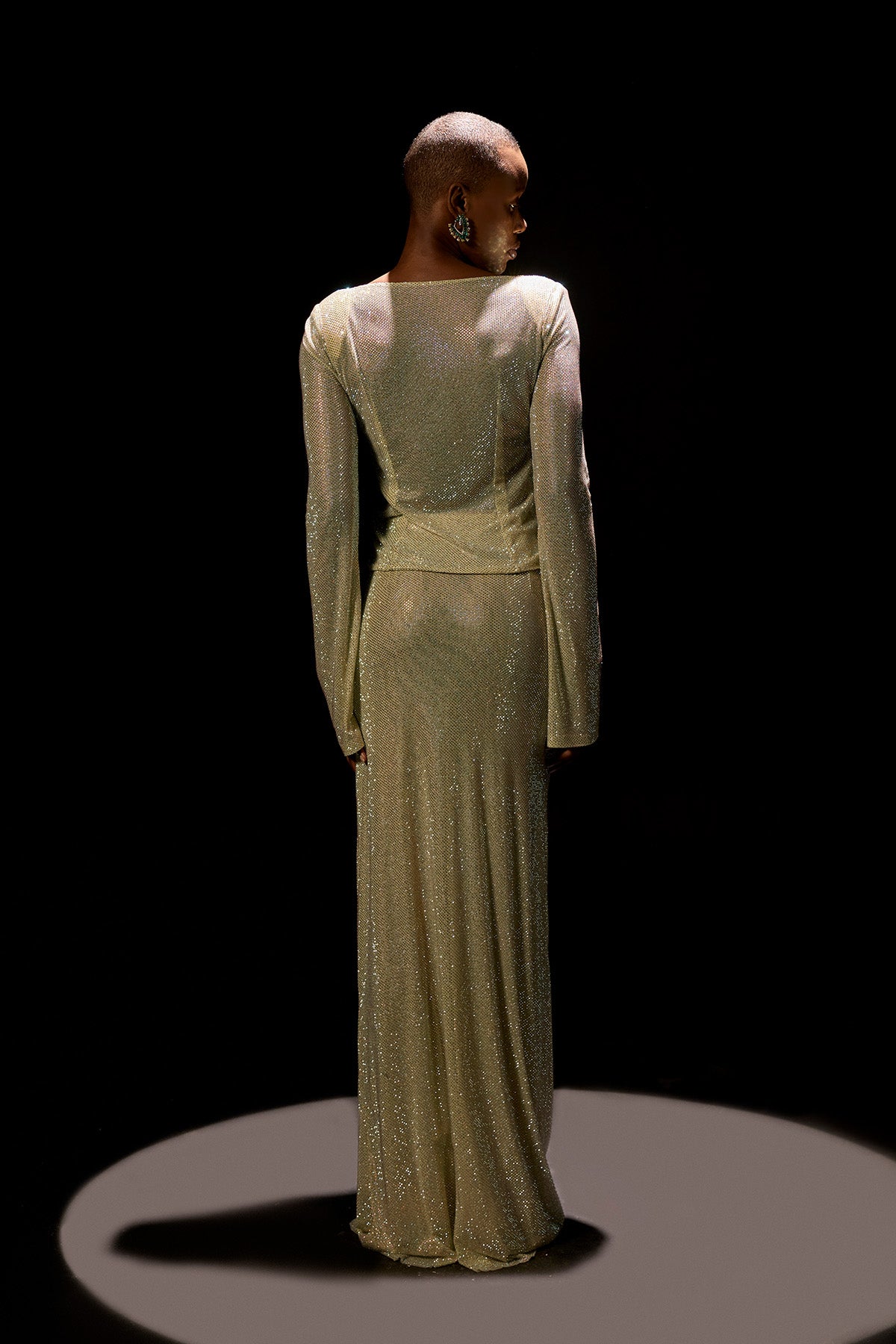 A Soft Pastel Green Coord Set Featuring A Fitted Pencil Skirt Paired With A Bell Sleeve Front Buttoned Top