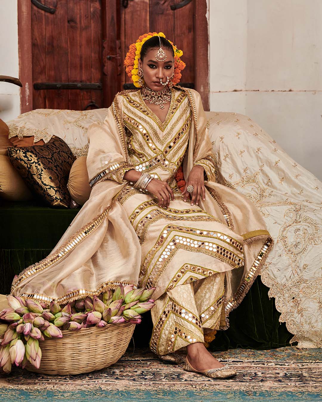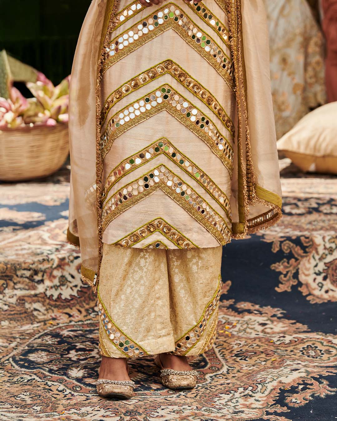 This Raw Silk suit set showcases exquisite mirror work , embellished with intricate, ghungroos, sequins, and nalki paired with brocade pants the outfit is completed with a tissue dupatta with kiran on border.