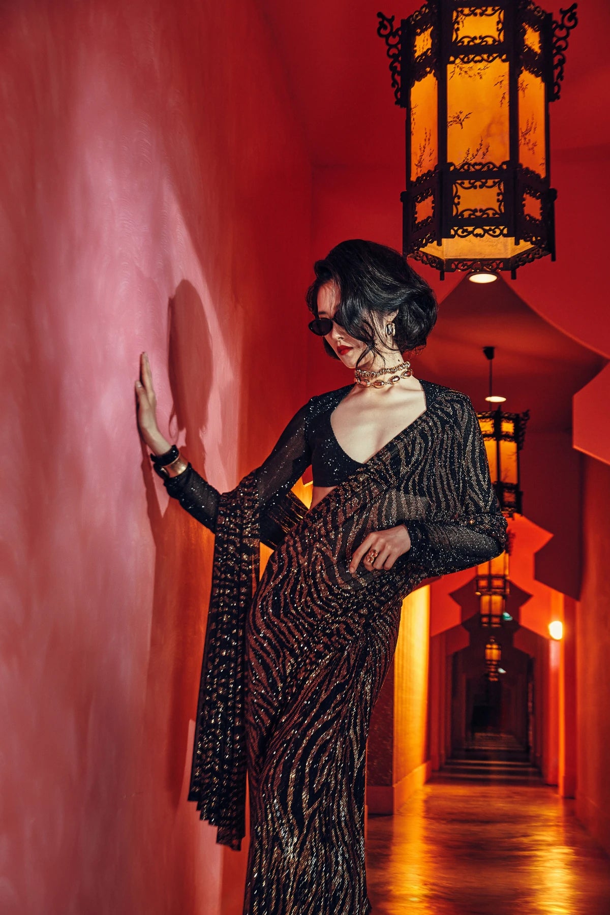 This saree set includes a full sleeves crystal embellished sweetheart neck blouse on net and a tiger print crystal embellished saree on net in black and gold.