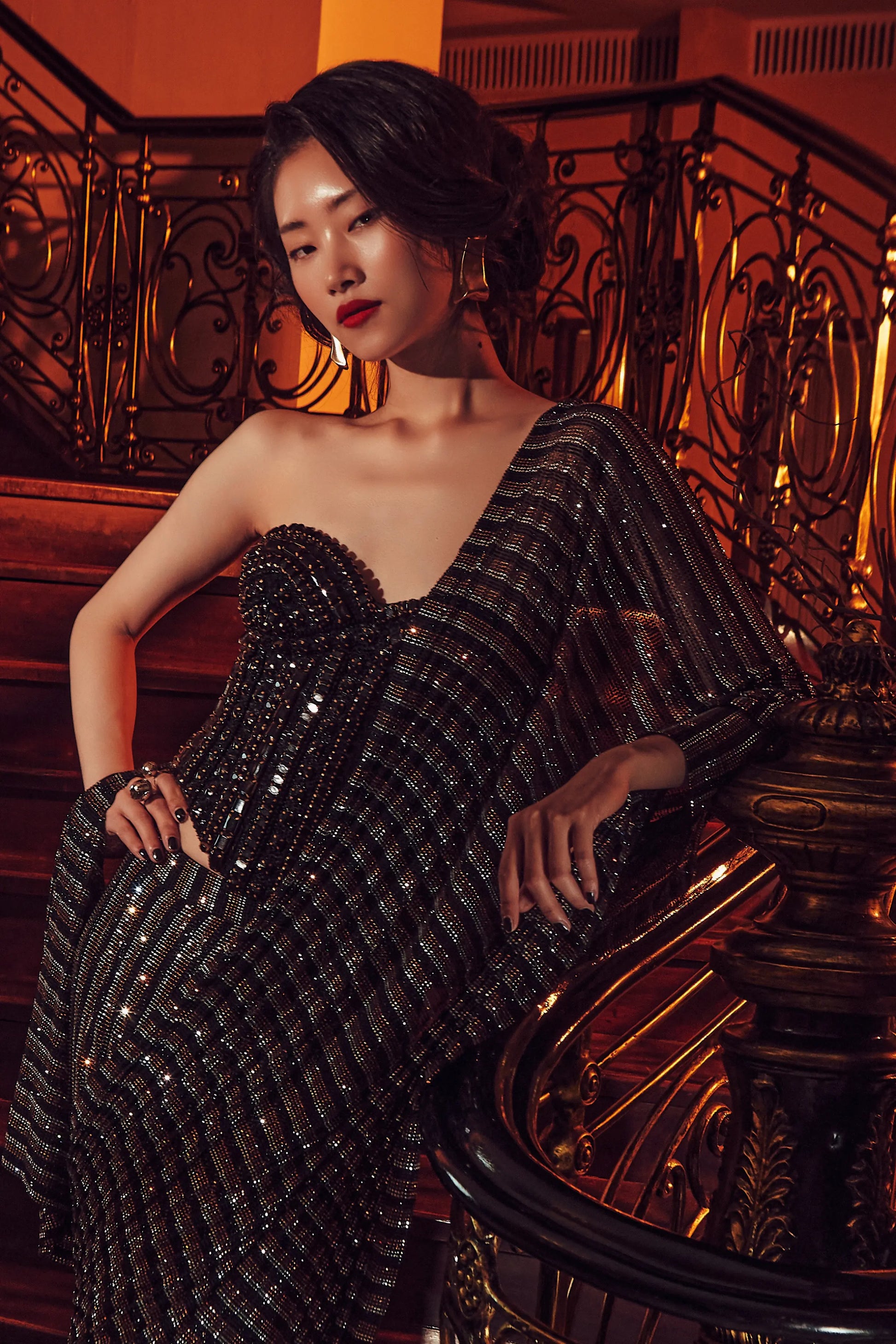 This saree set includes a black mix media stone embroidered sweetheart neck corset with rope closure at the back and a pinstripe print crystal embellished saree in black, gold, and silver.