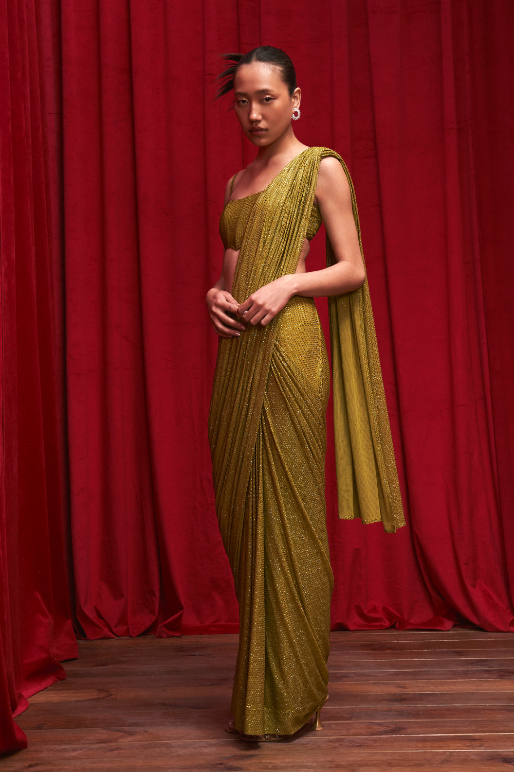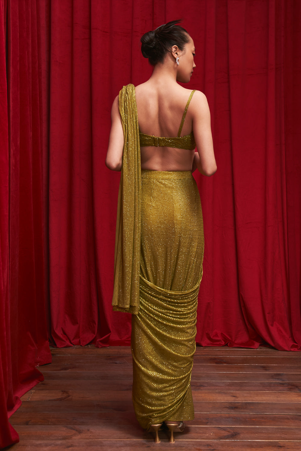 Olive crystal embellished pre-stitched saree paired with a corset