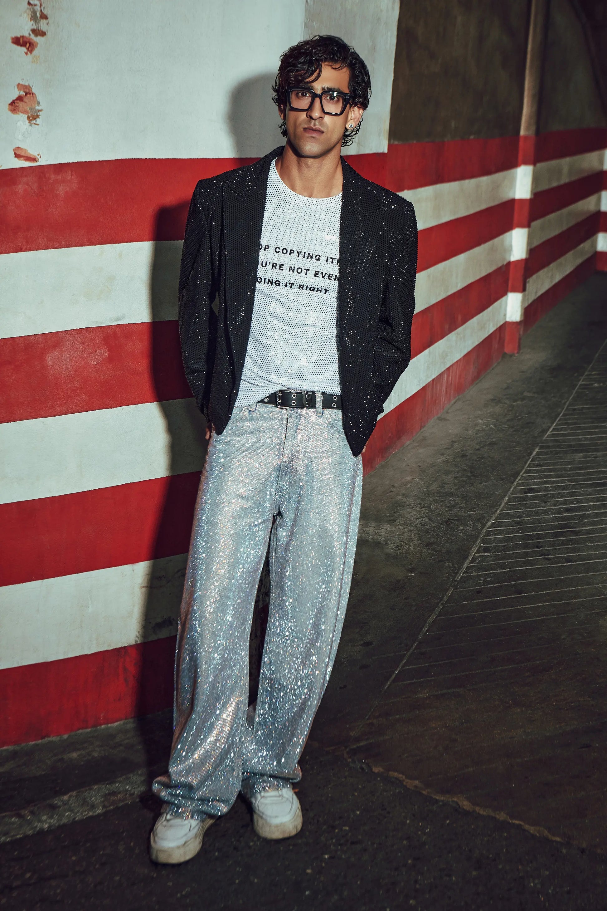 Color: Black jacket with white Tee and Silver Denims
