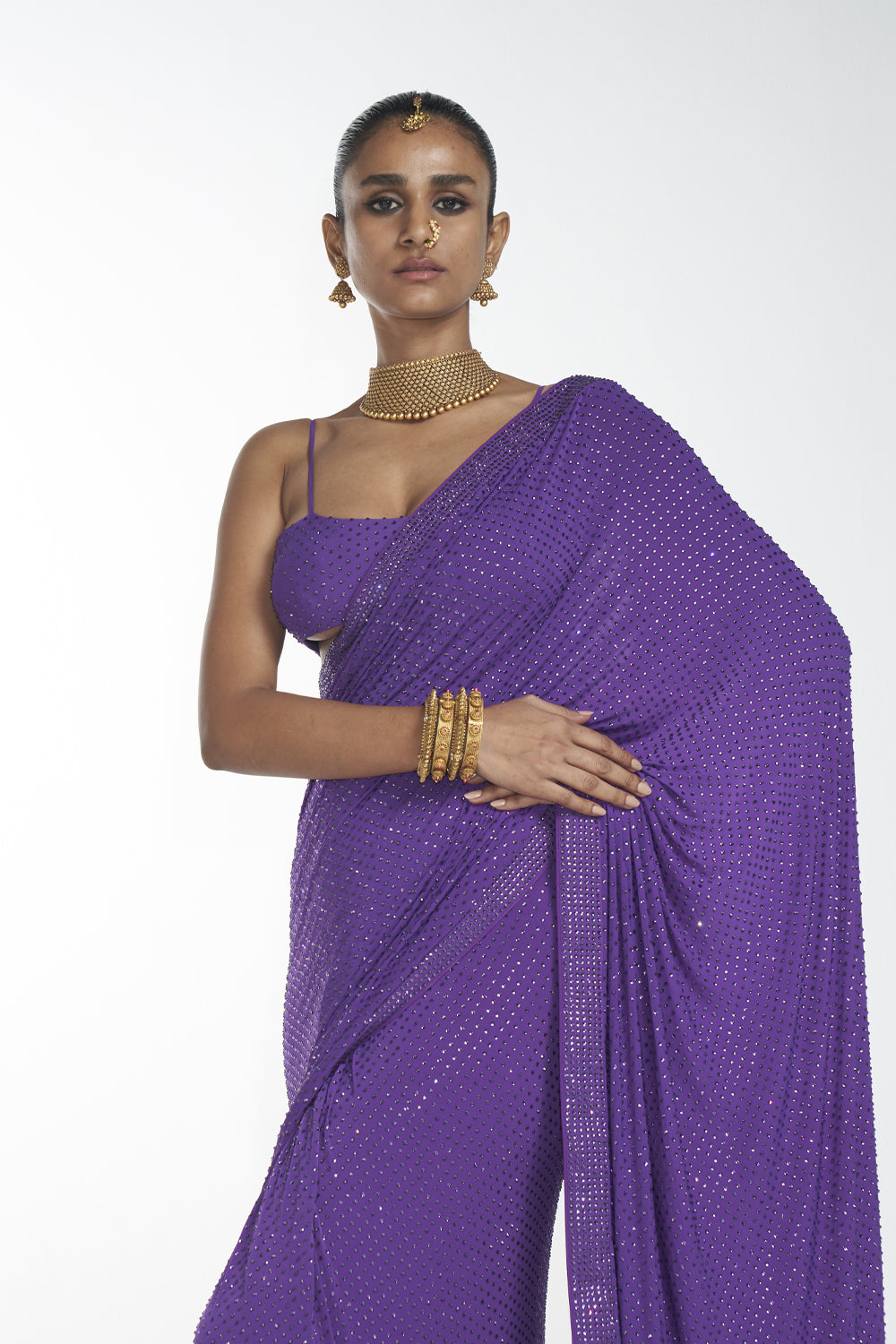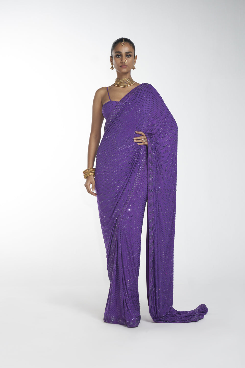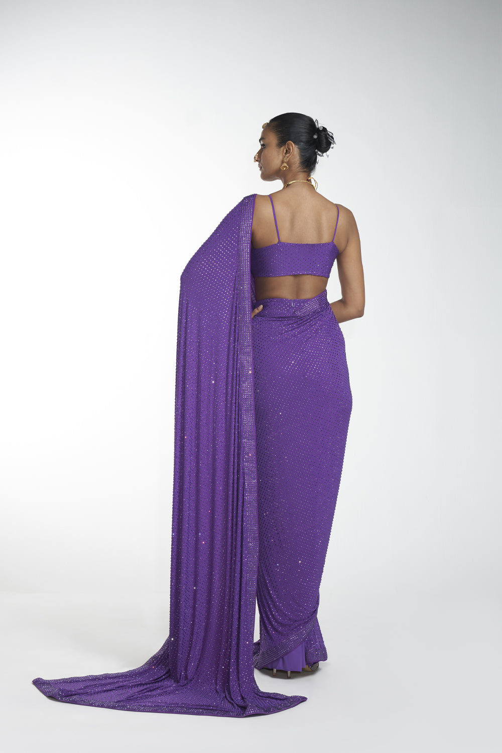 Tanzanite Crystal PRESTITCHED jersey saree with purple crystal jersey blouse