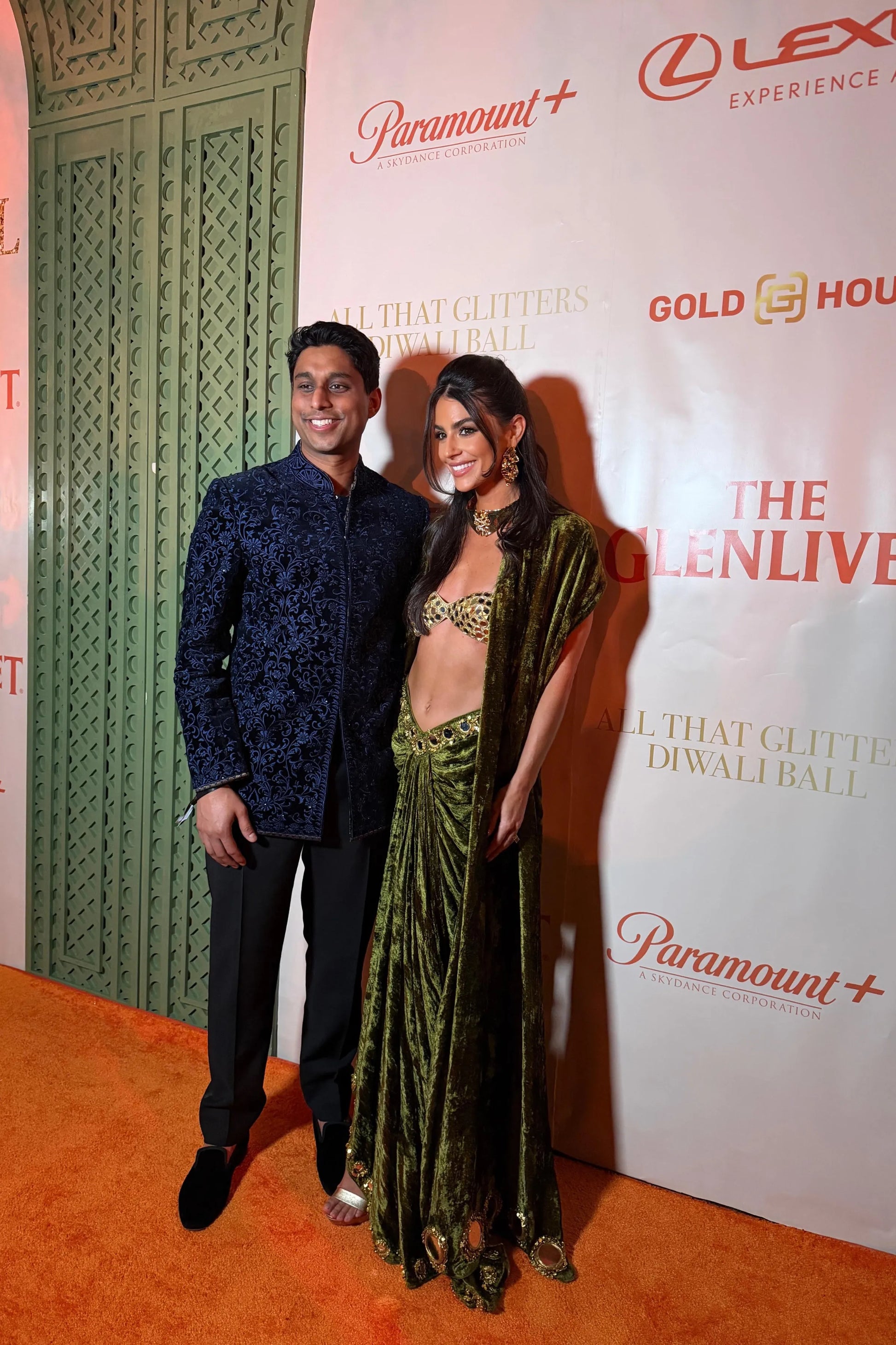 Velvet green skirt with mirror embellishments on belt and border , paired with a mirror blouse and a velvet dupatta.