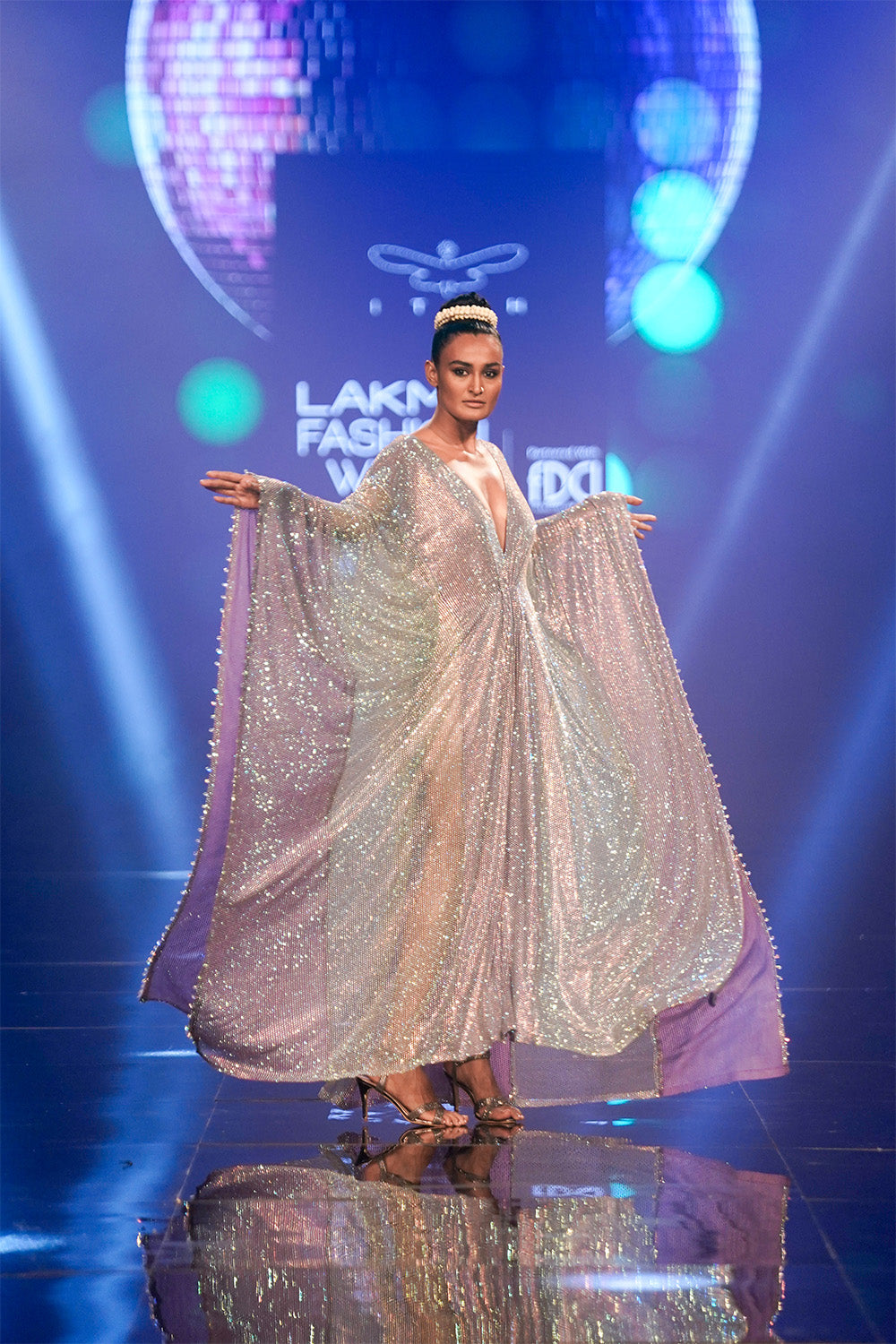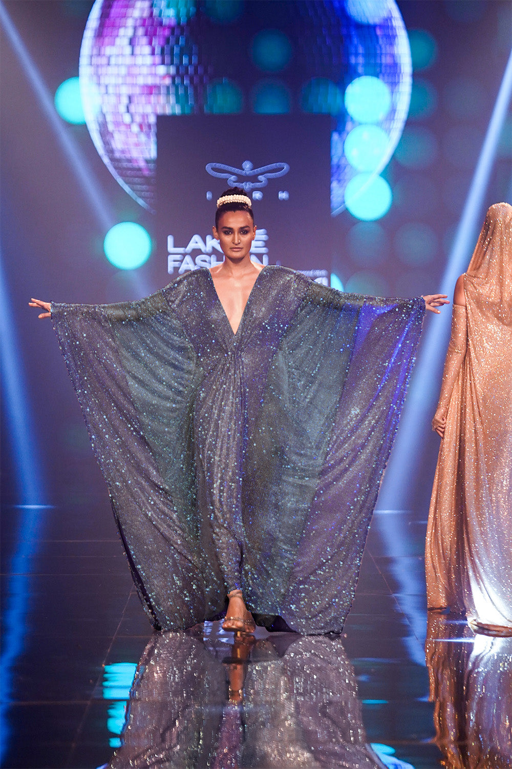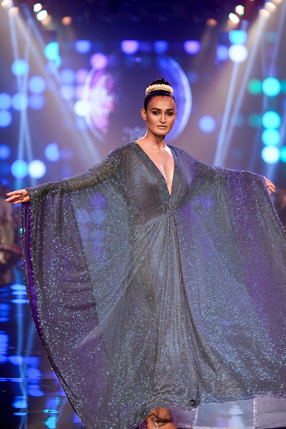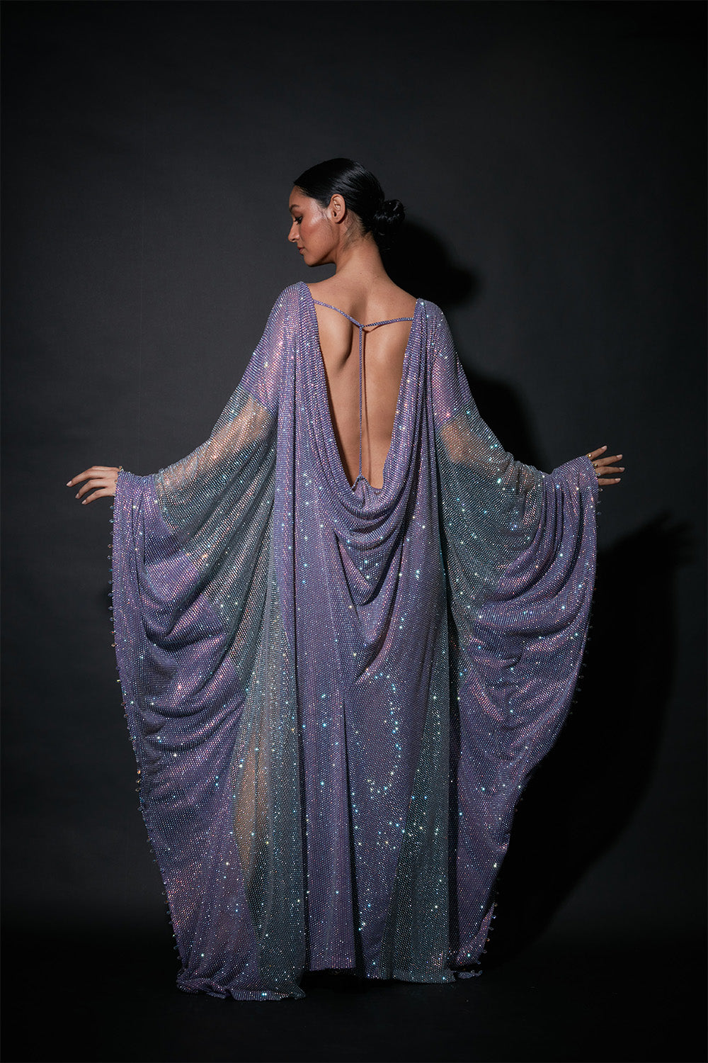 Embellished Sharp V Neck Kaftan in Double Shade of Lilac and Silver.