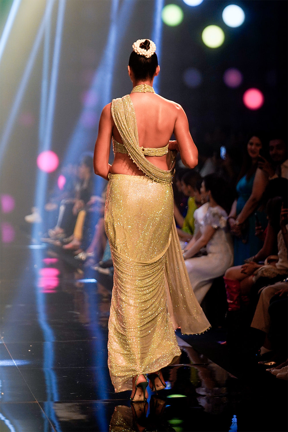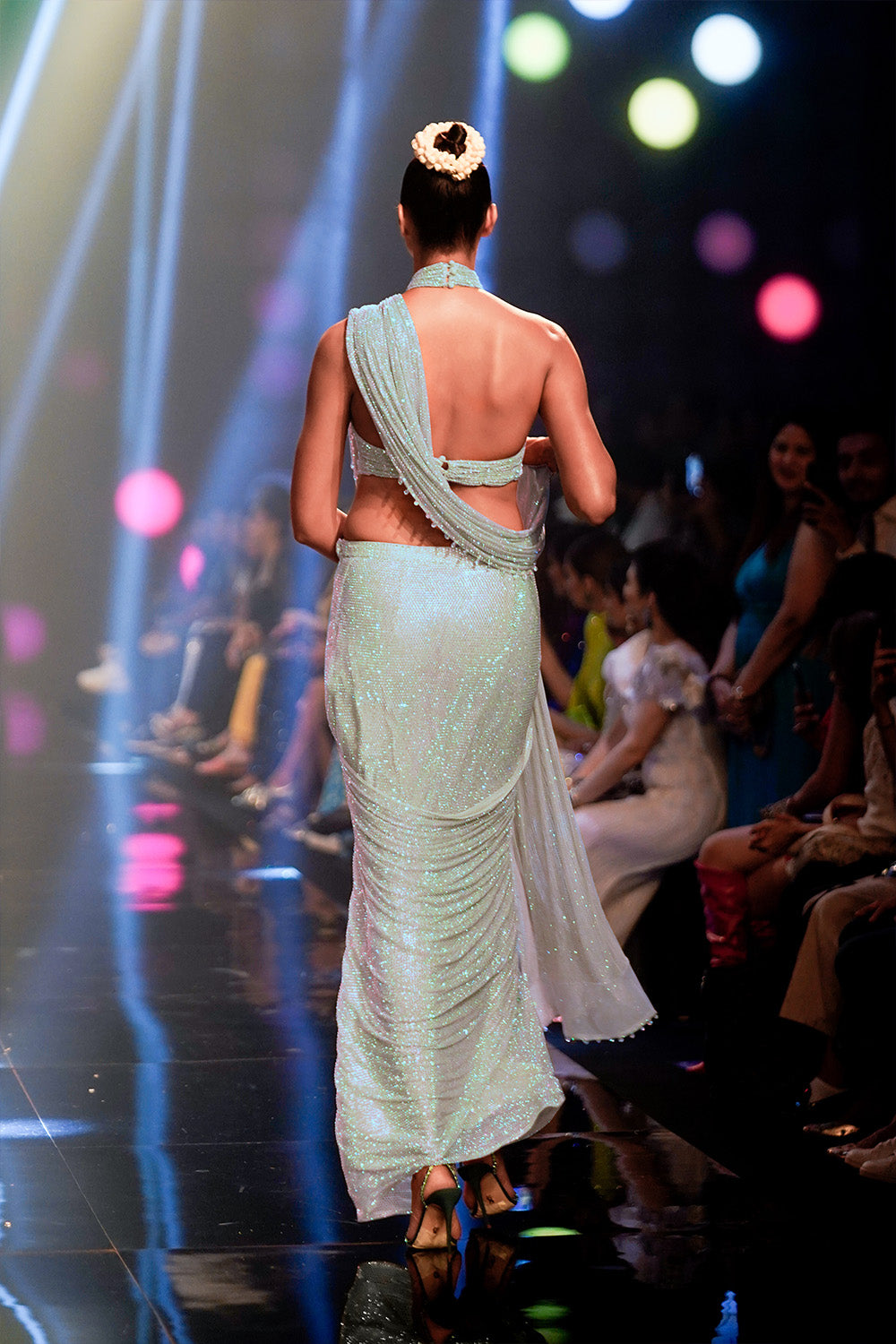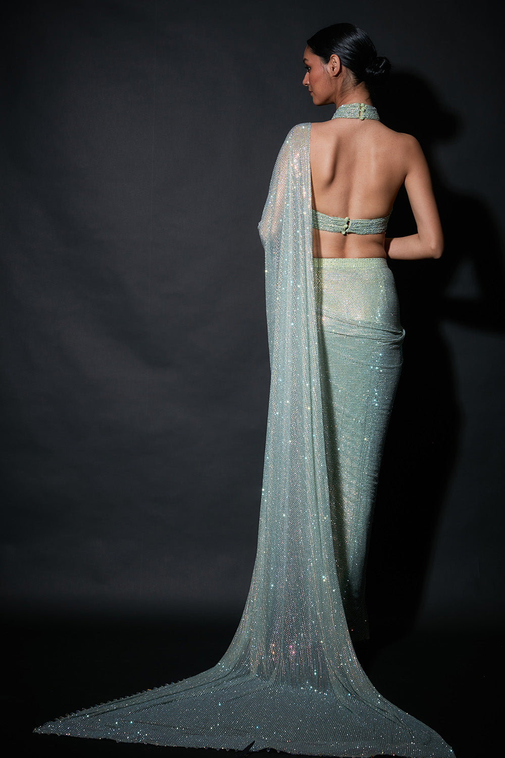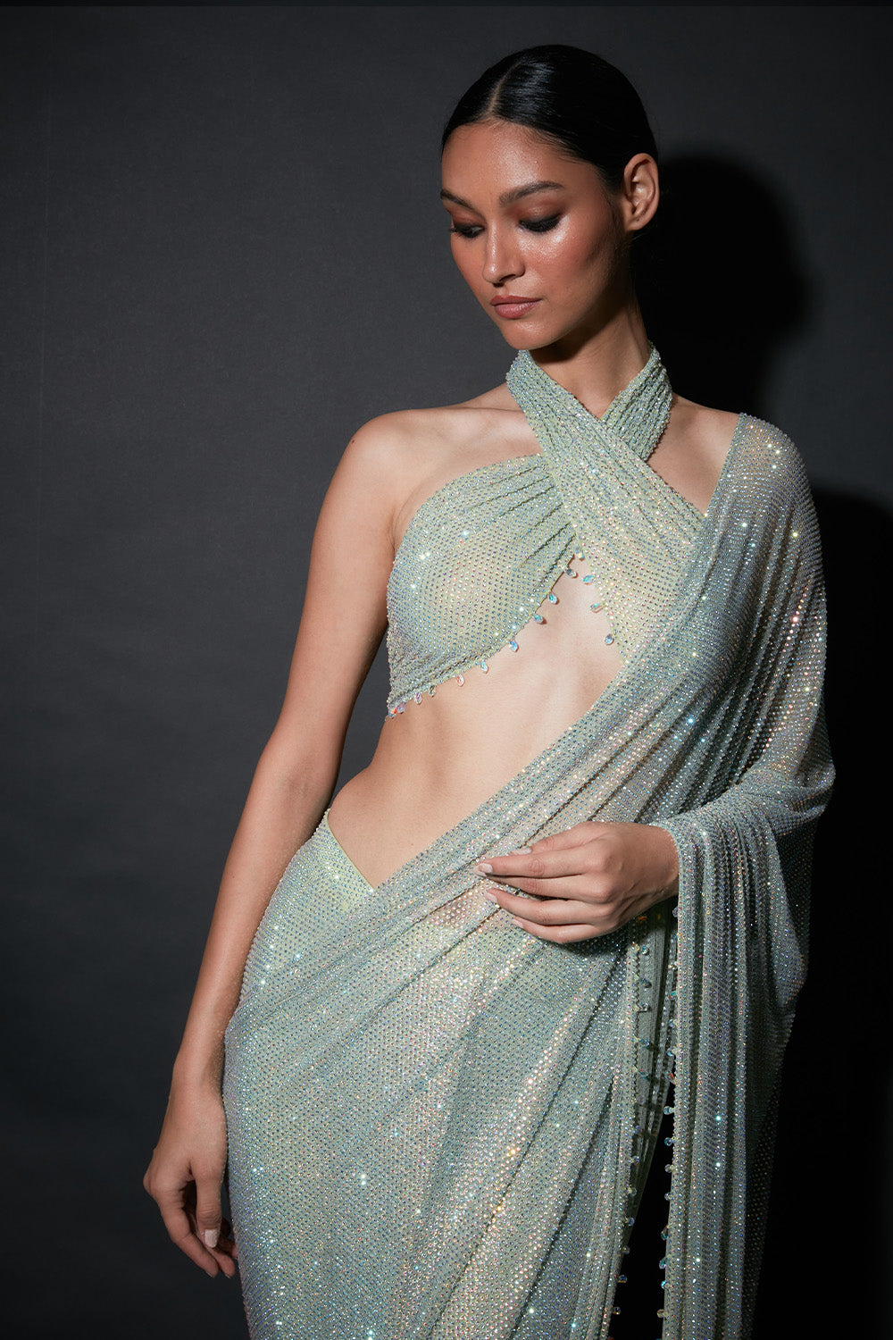 Pre-draped Saree in Refreshing Shade of Mint Green, Constructed in an Accentuating Silhoutte Paired With Halter Blouse.