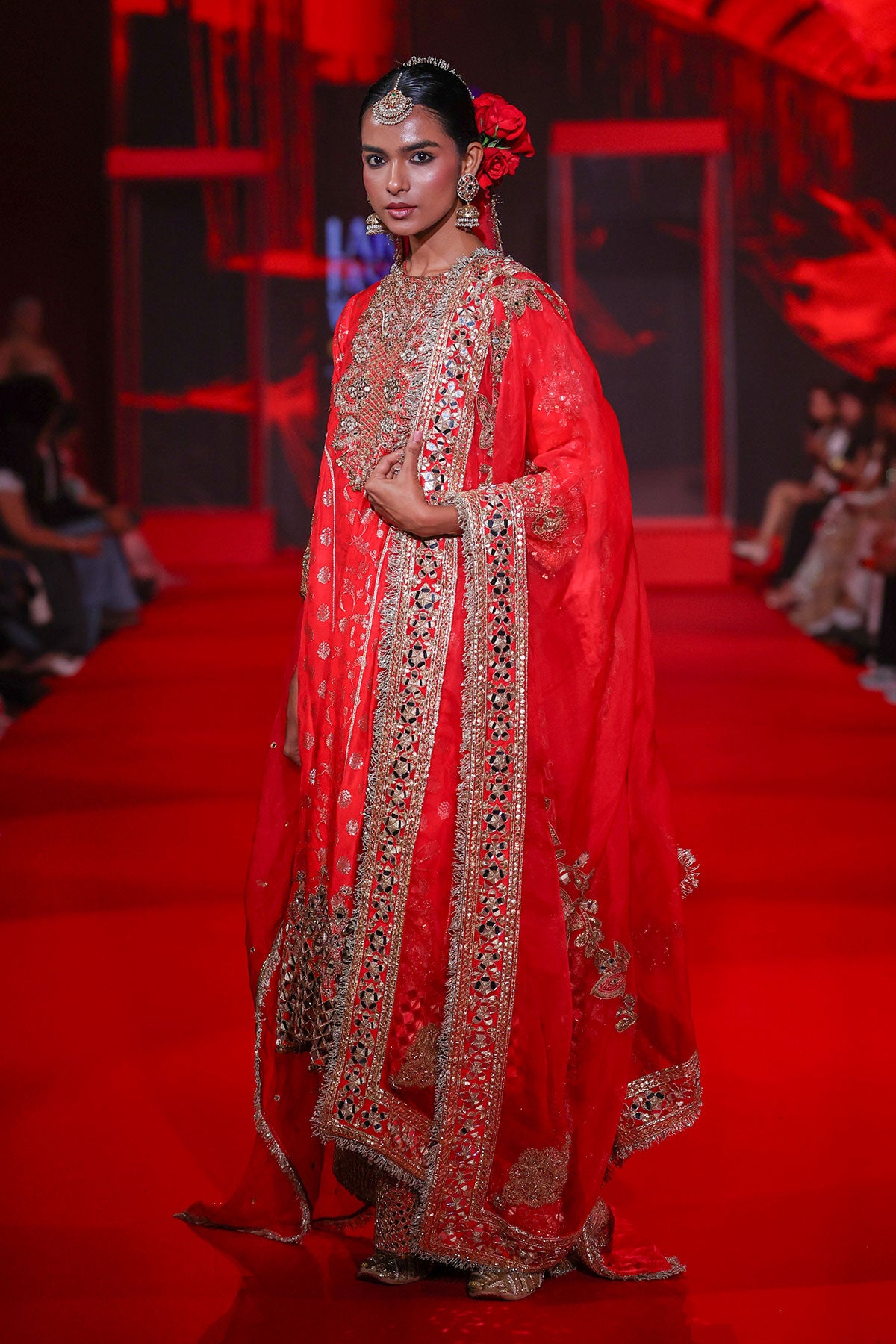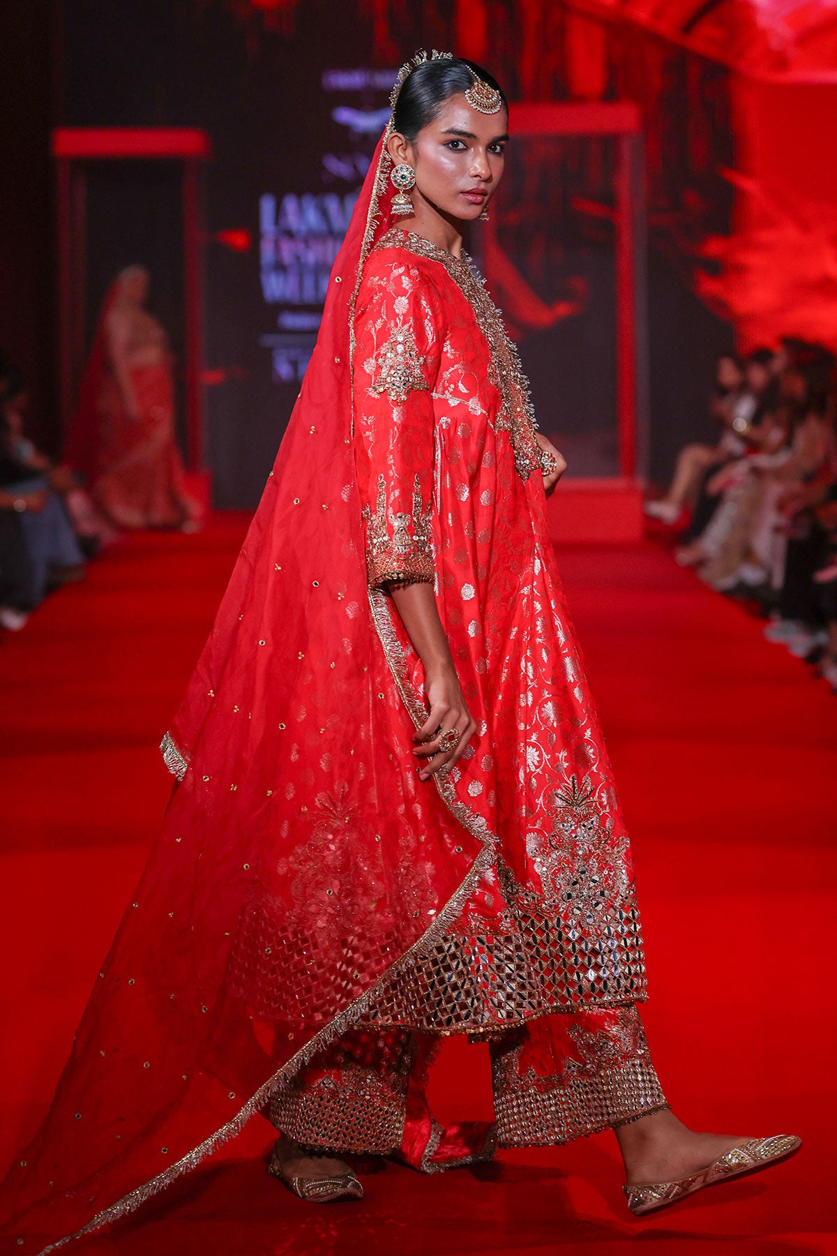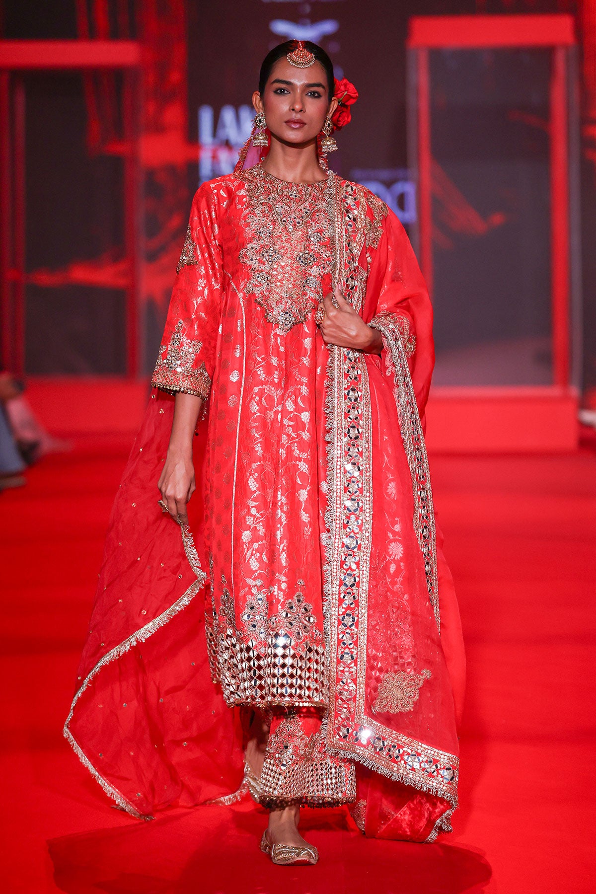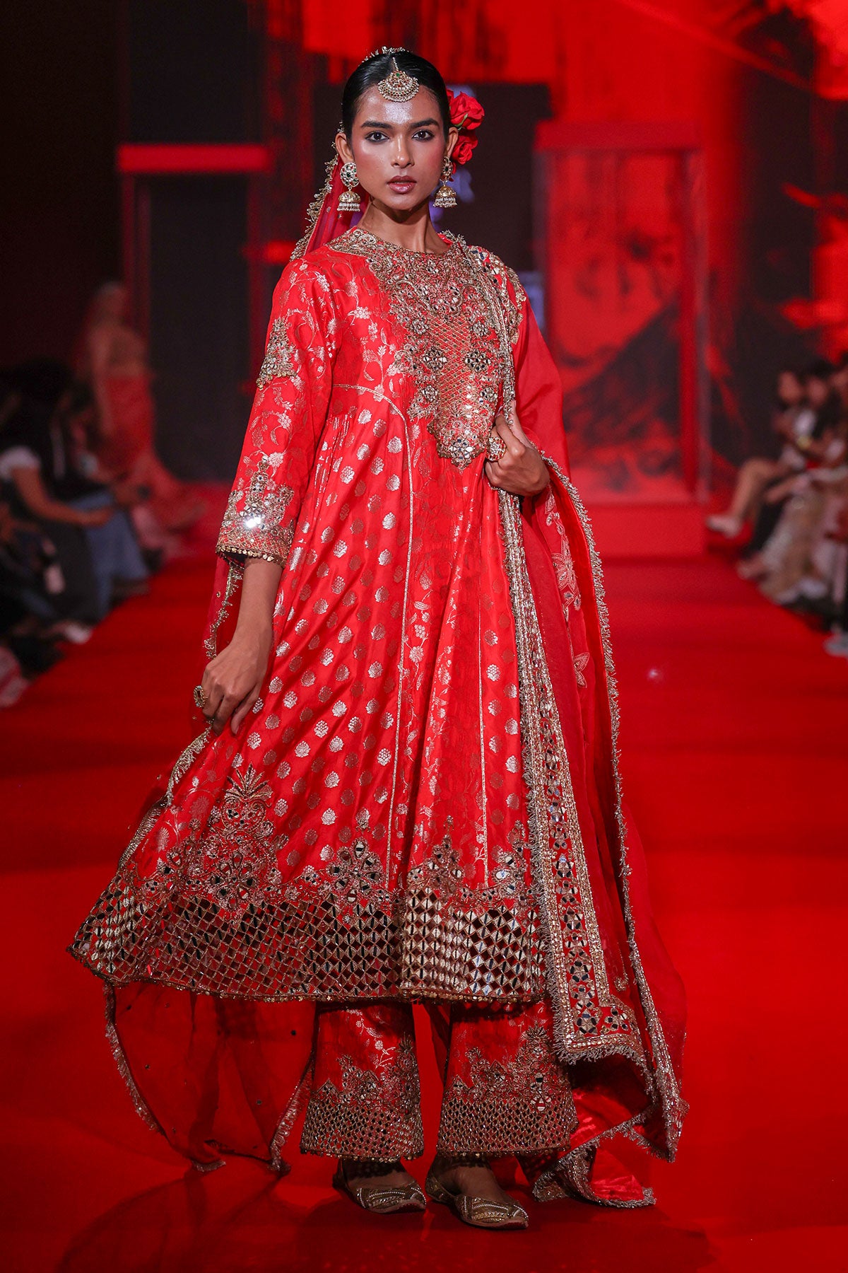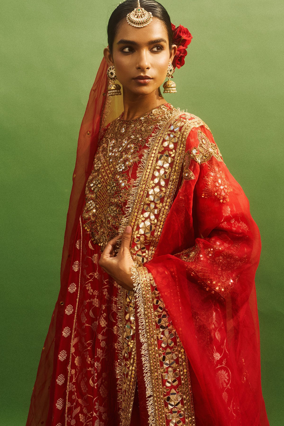 Red Brocade kurta with intricate embroidered yoke and border paired with red brocade pants with cutwork embroidery and red organza embroidered dupatta.