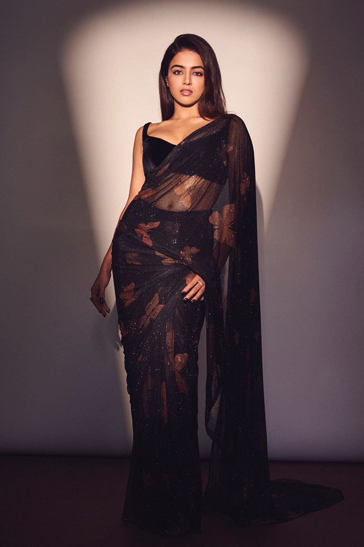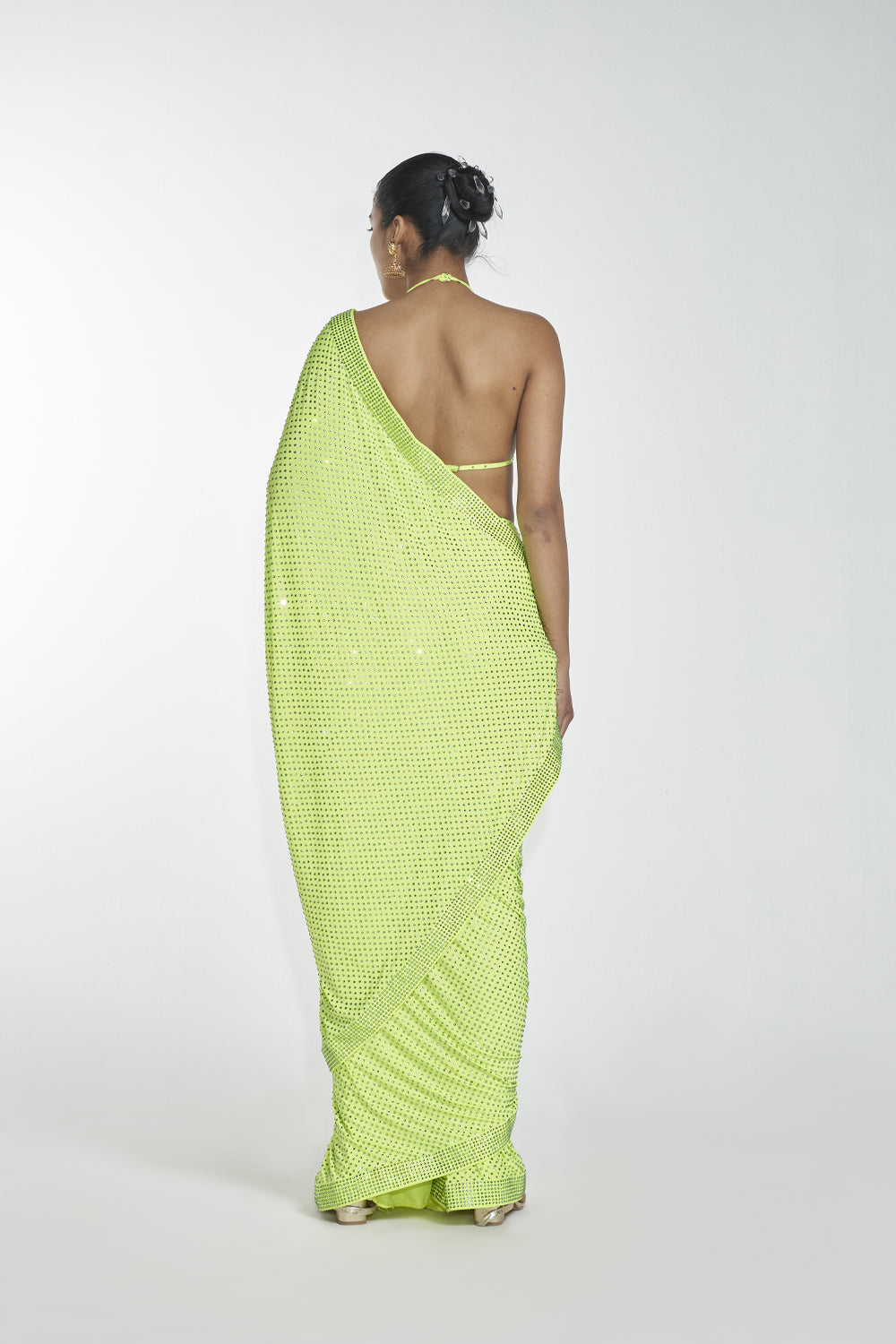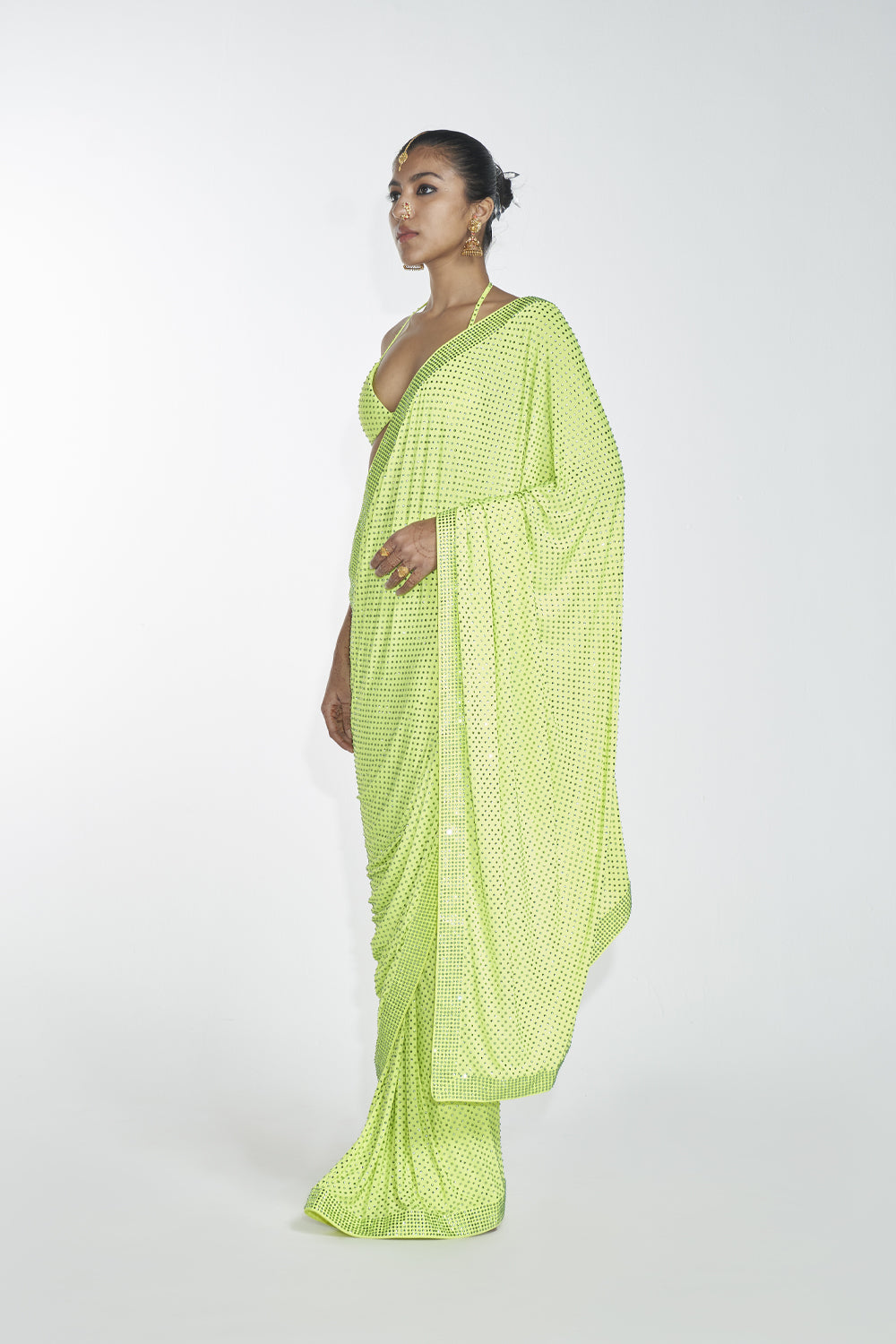 Peridot Crystal embellished pre-stitched saree and sleeveless blouse in jersey.