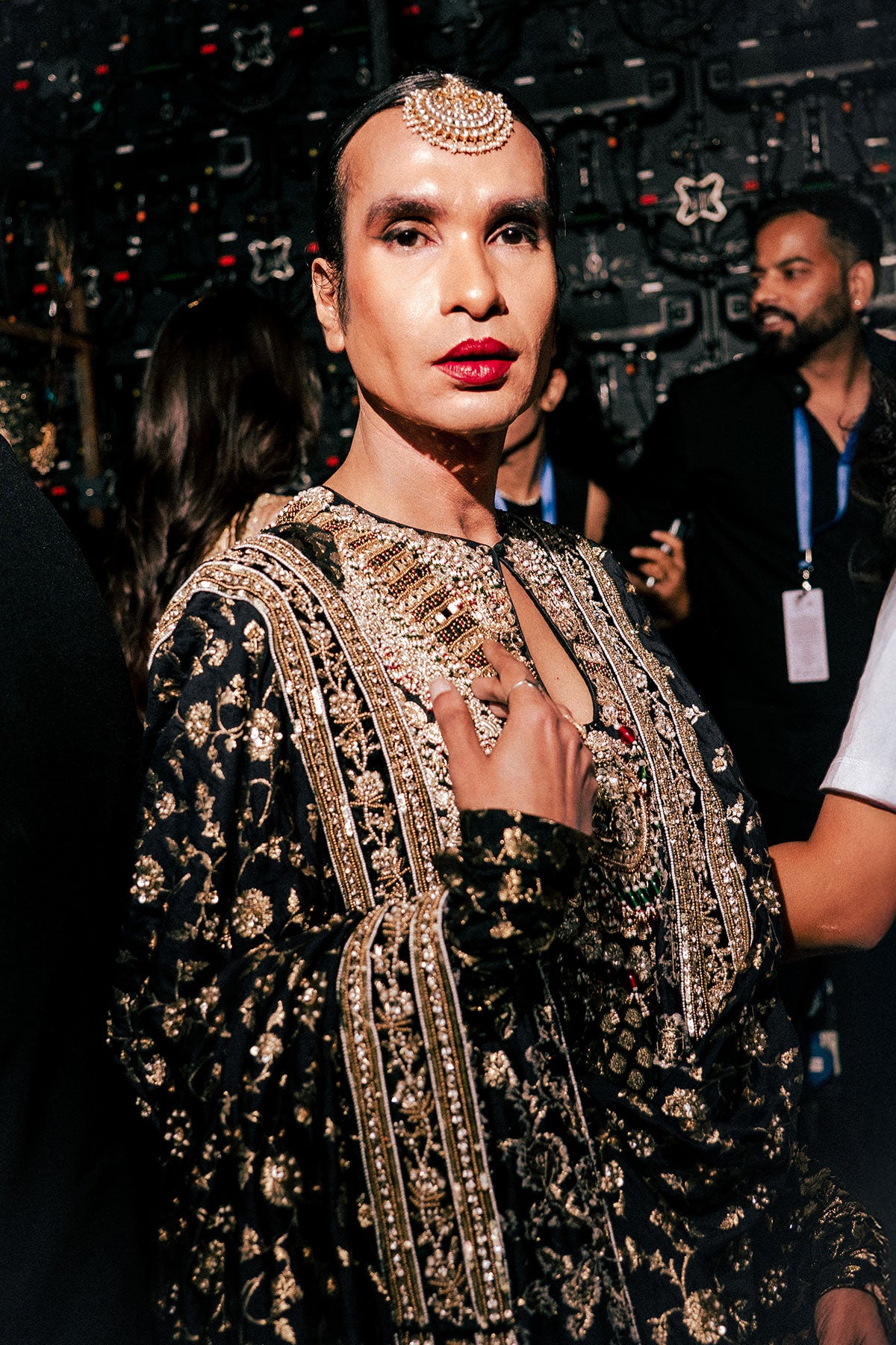 This black brocade anarkali features a jewelled and embellished stone neckline with intricate detailing. The ensemble showcases rich brocade panels in tones of black with metallic accents, paired with a matching dupatta. Perfect for luxury bridal wear and grand celebrations.