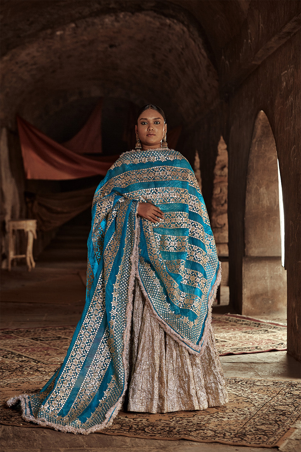 A radiant lampi lehenga paired with a handcrafted mirror jhalar blouse and a tissue dupatta that glimmers with every move. This ensemble captures the essence of timeless grandeur perfect for festive soirées and wedding revelries.