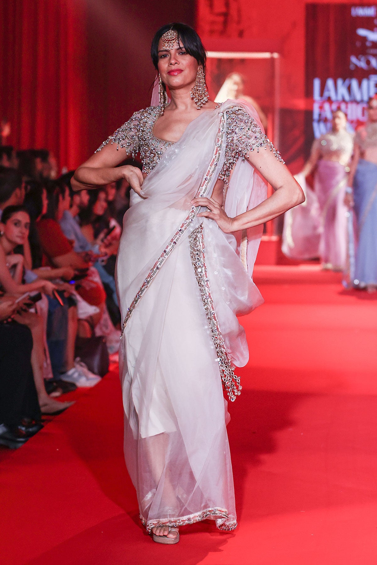 White Organza silk saree with intricate border of jadau embroidery and beads, paired with a heavily embellished jadau blouse. A modern classic for festive and bridal occasions.
