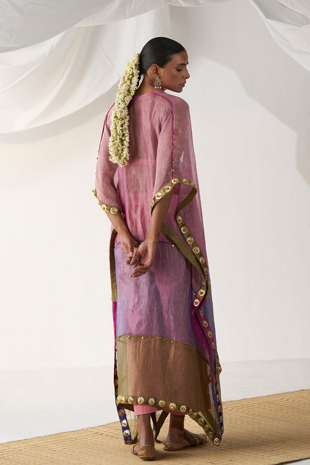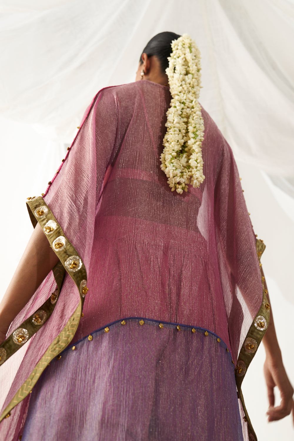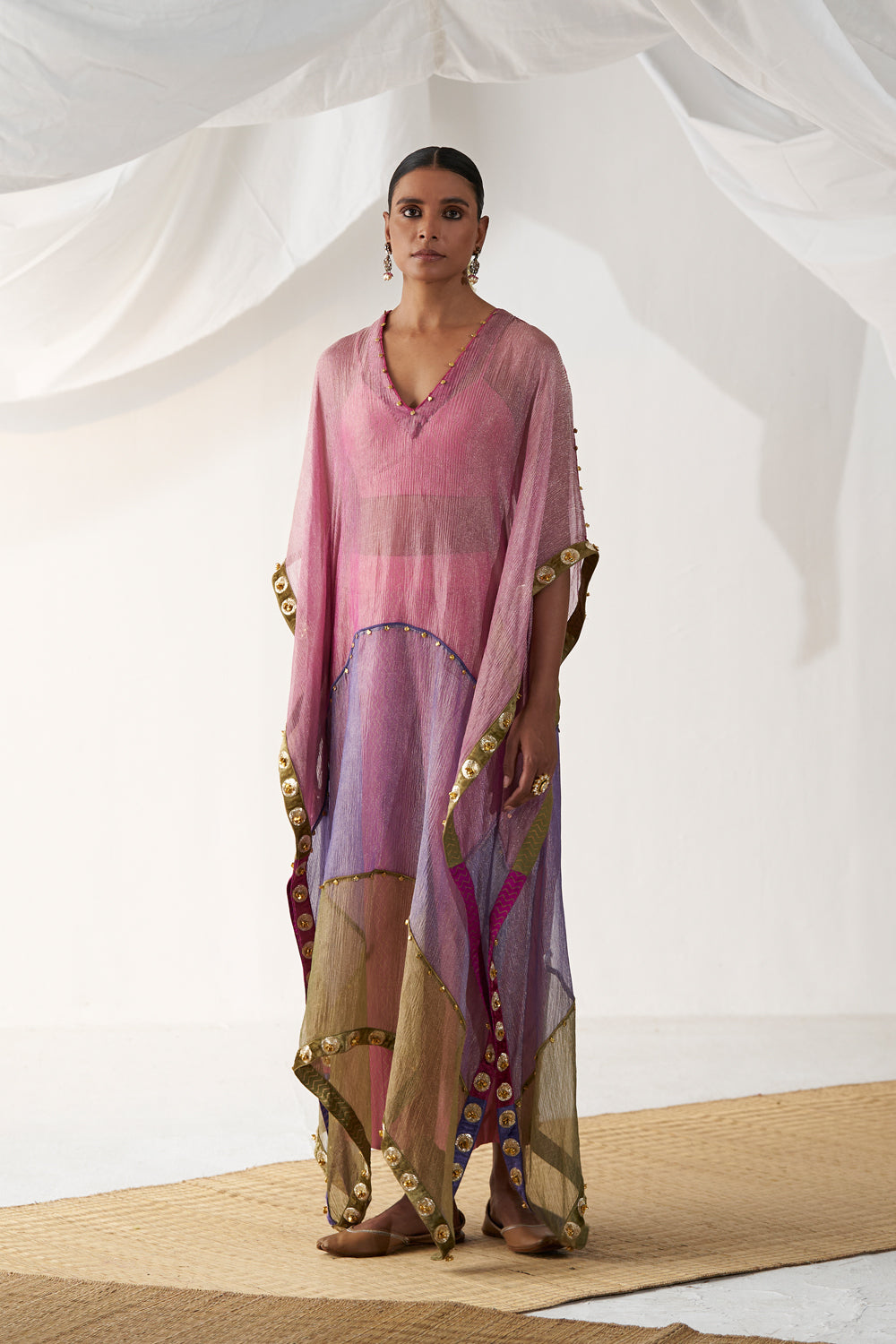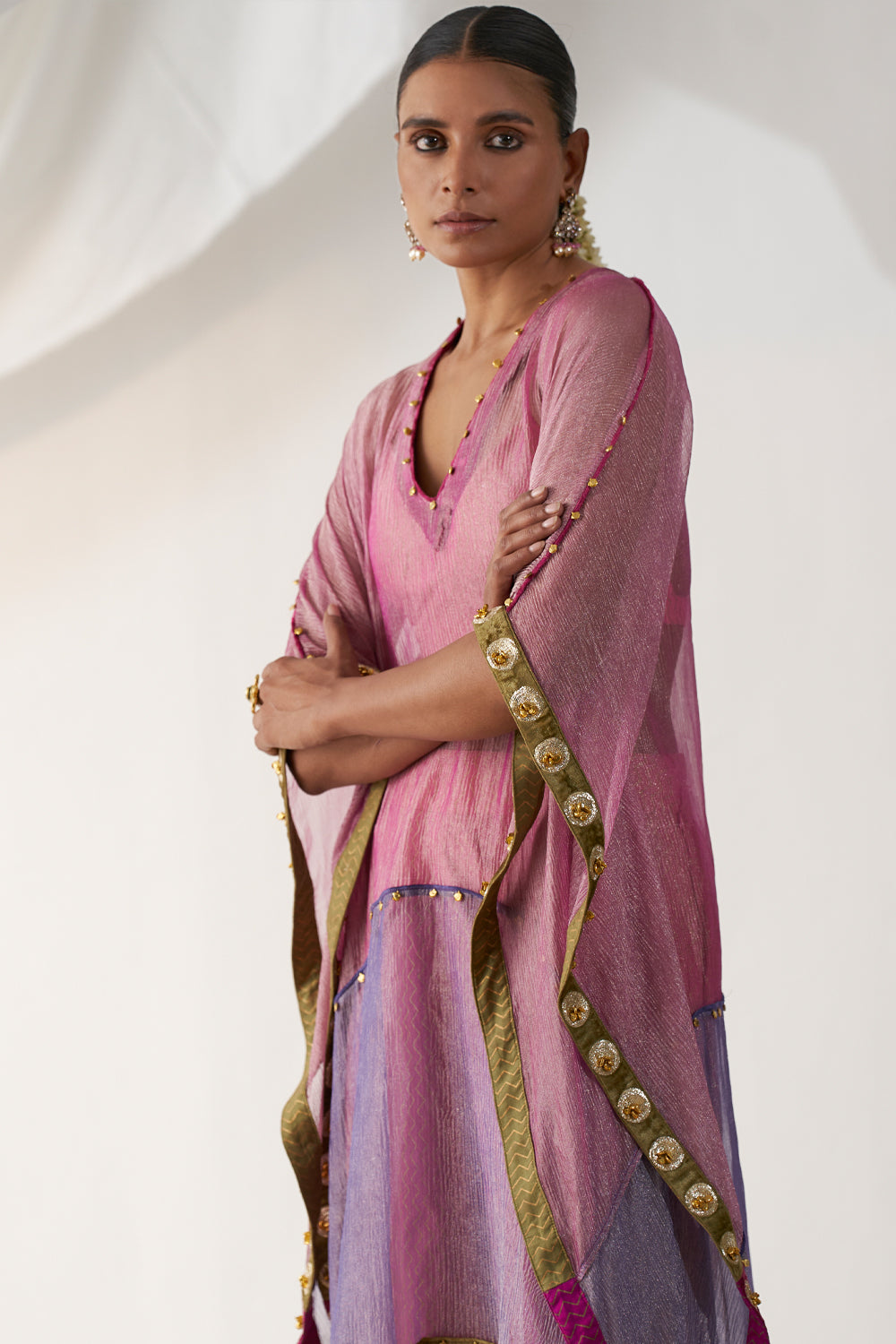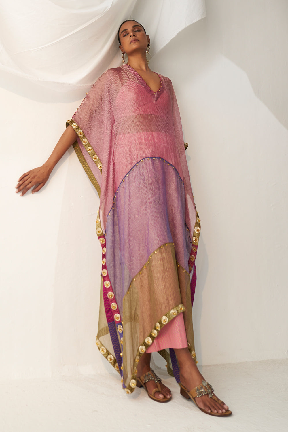 Antique dot embellished on velvet, outlined all over on the color blocked kaftan with horizontal gota and ghunghroo detailing.
