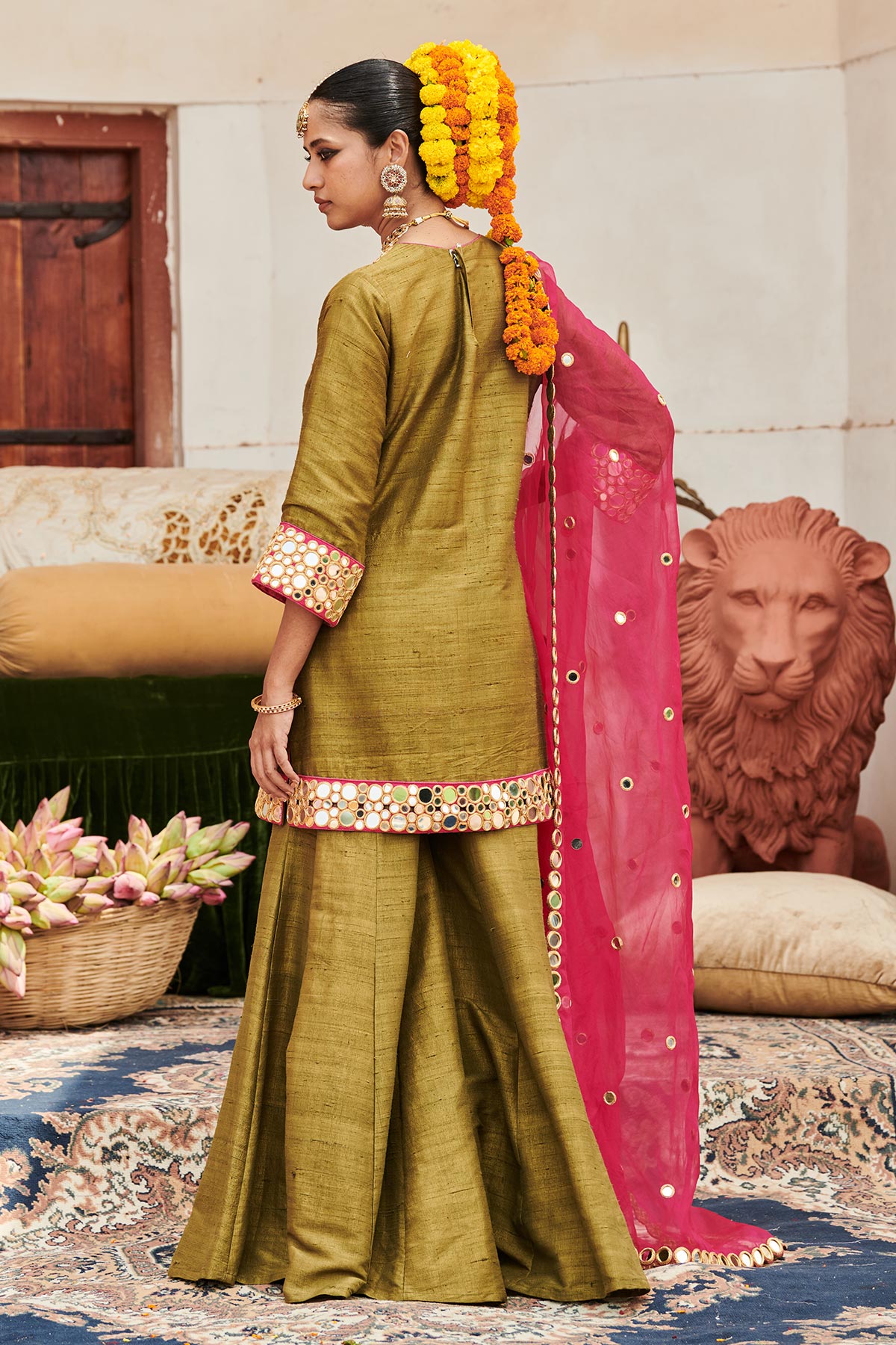 Green Raw Silk sharara set with mirror work on tunic and matching pants is paired with a contrasting pink organza dupatta