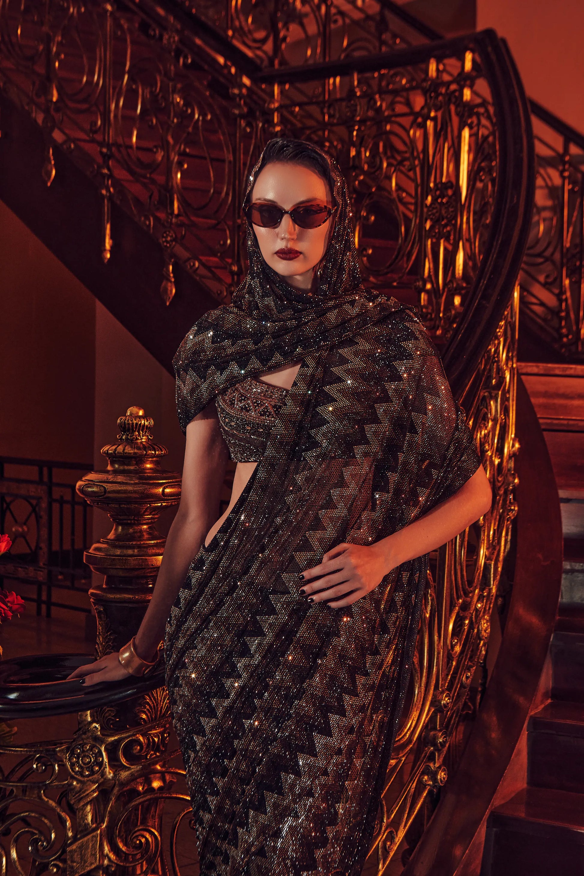 This saree set includes a cap sleeve round neck mix media stone and beads embellished blouse and a chevron print crystal embellished saree in black, gold, dark gold, and silver.