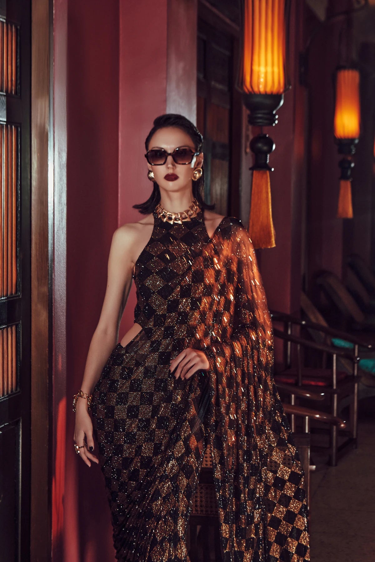 This saree set includes a check print crystal embellished halter neck leotard on net and a matching check print crystal embellished saree on net in black and gold.