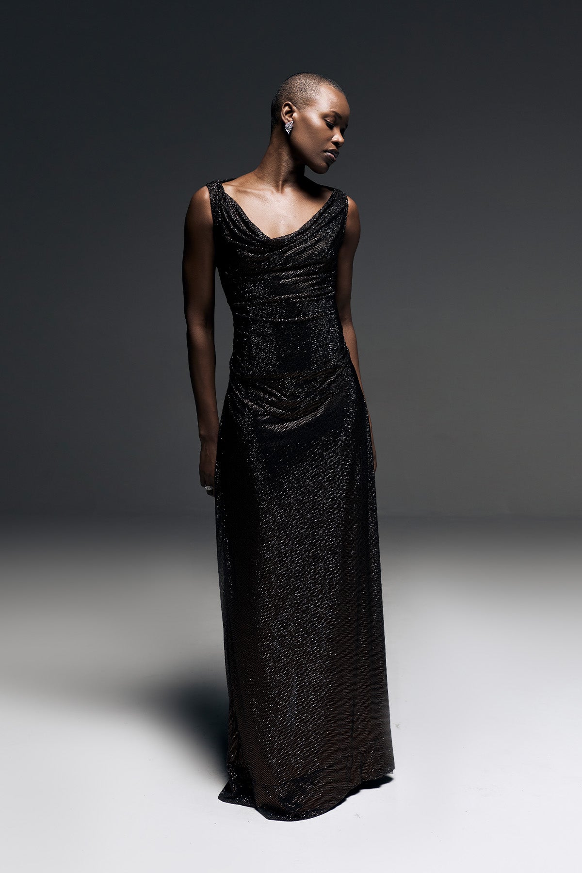 Brown Crystaled Corseted Cowl Draped Gown