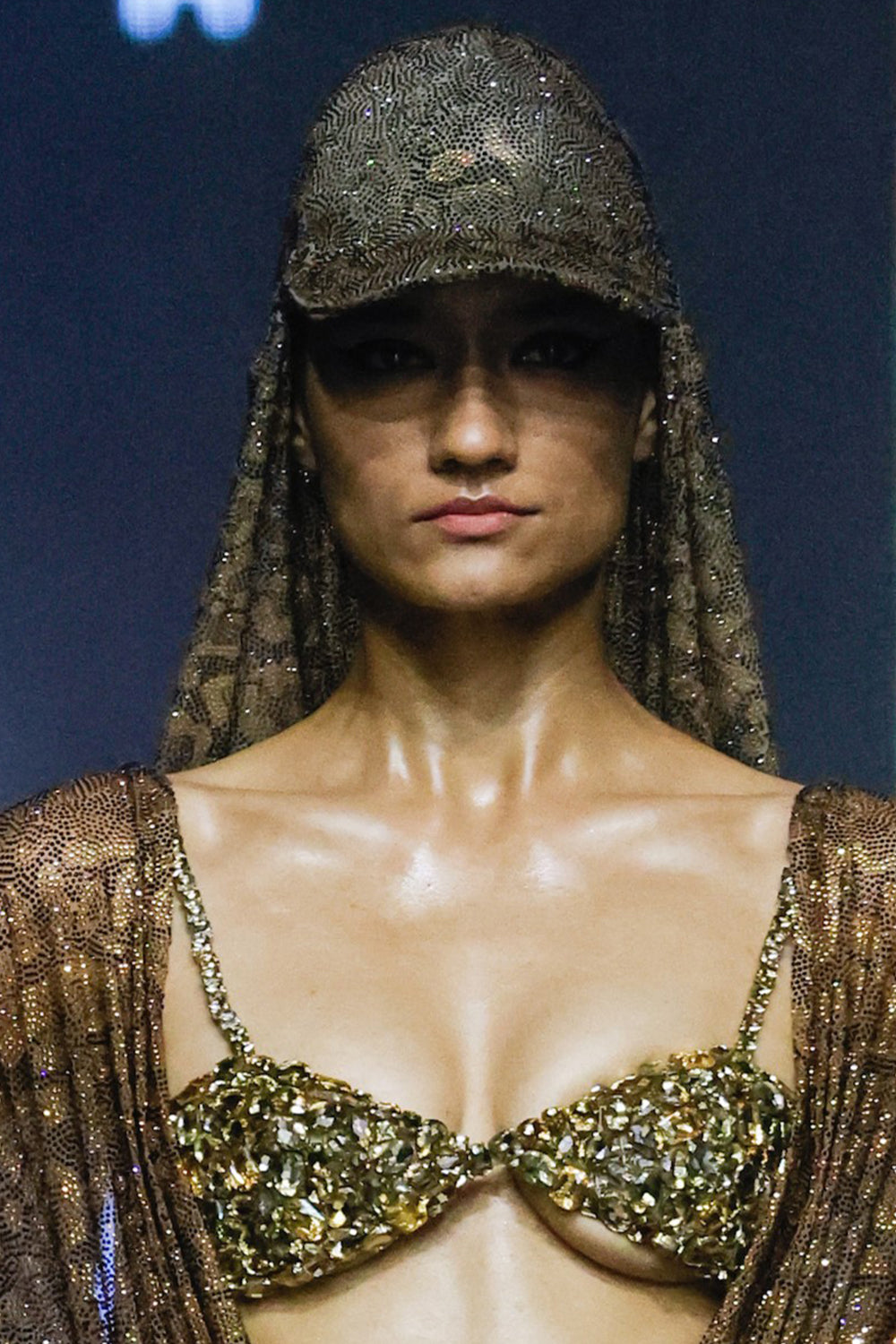 Our Untamed Glam cap highlights a crystal-embellished embroidery all over the cap with an attached crystal scarf.