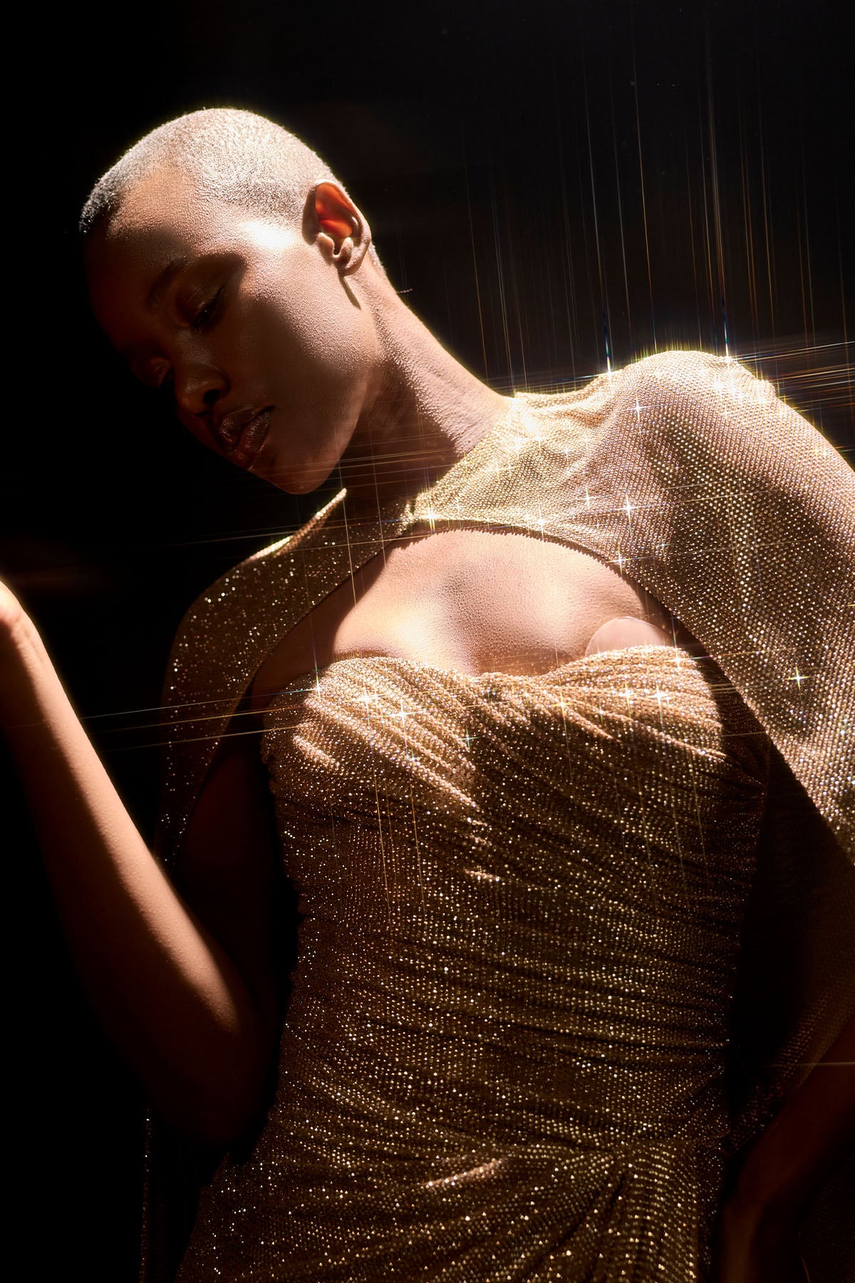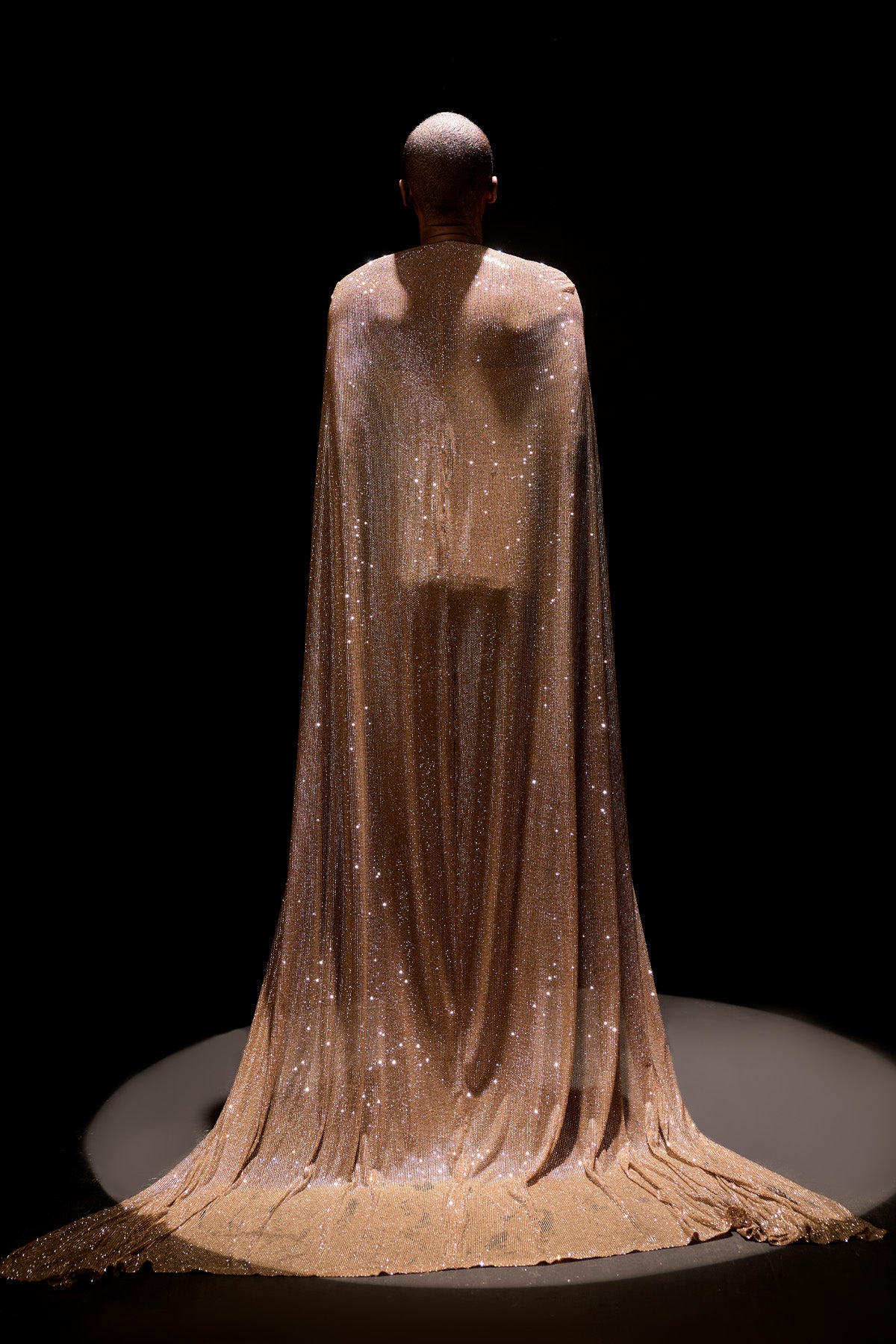 Warm Nude Crystaled Draped Body Corseted Gown With A High Slit And An Overcape With Trail