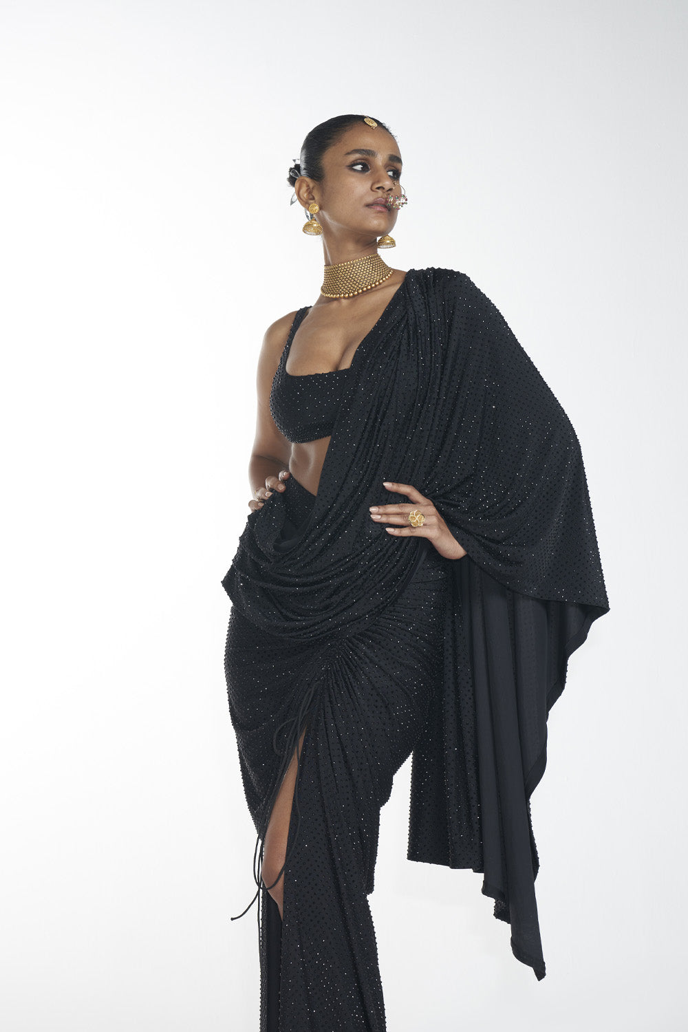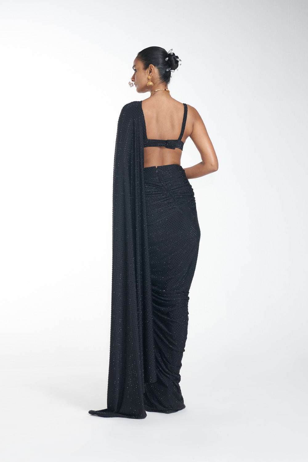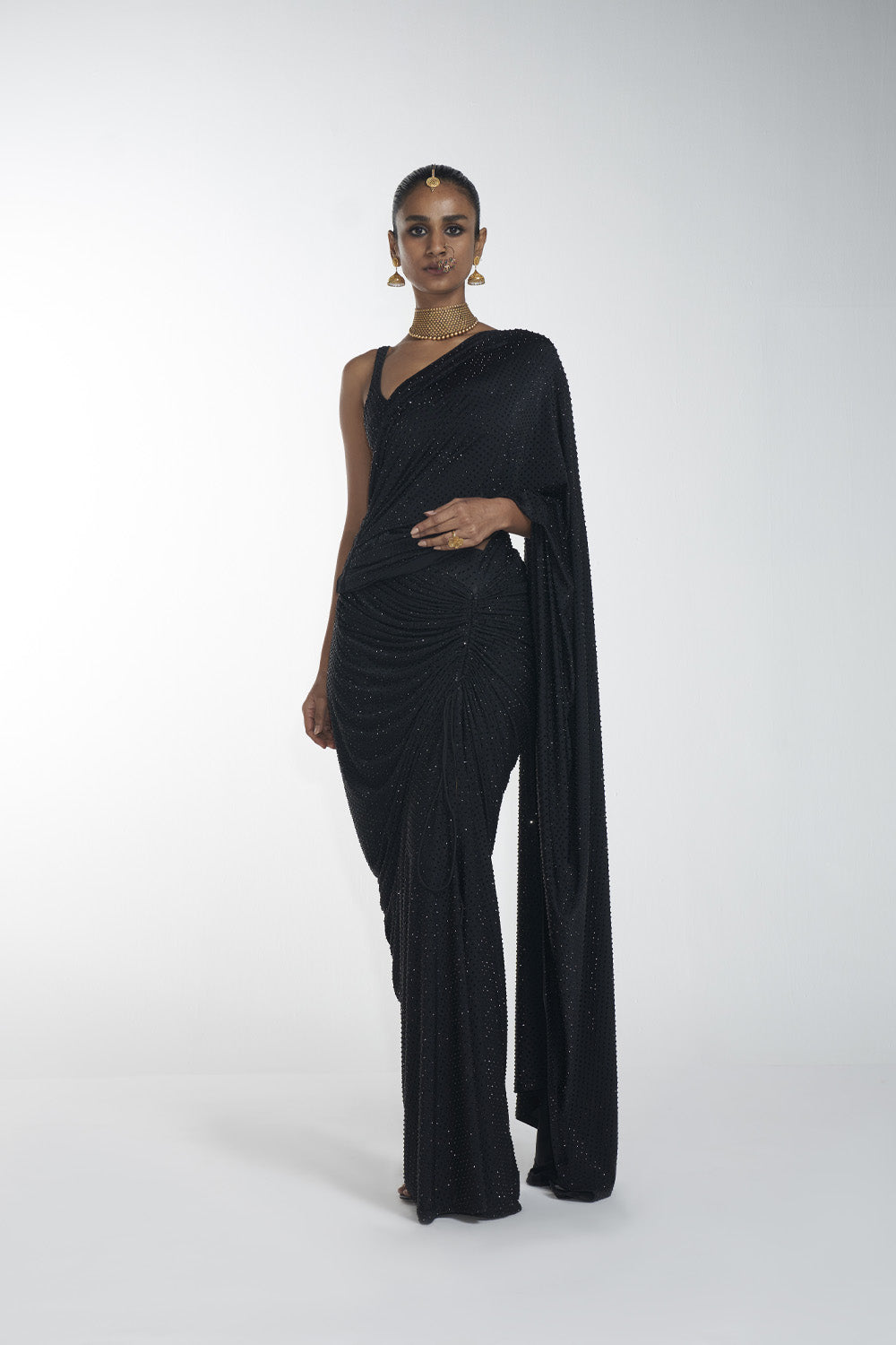 Pink Crystal embellished pre-stitched saree and sleeveless blouse in jersey.