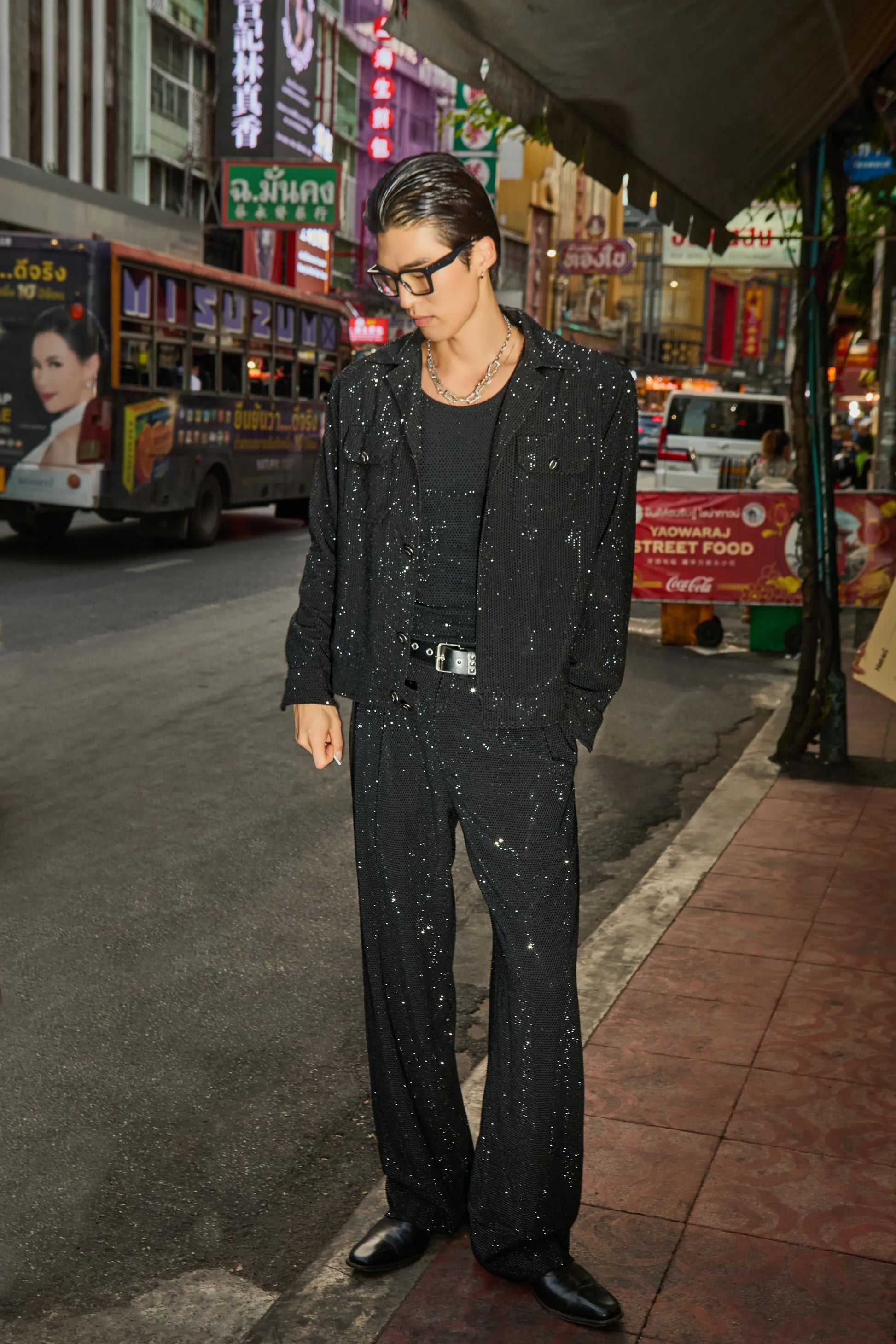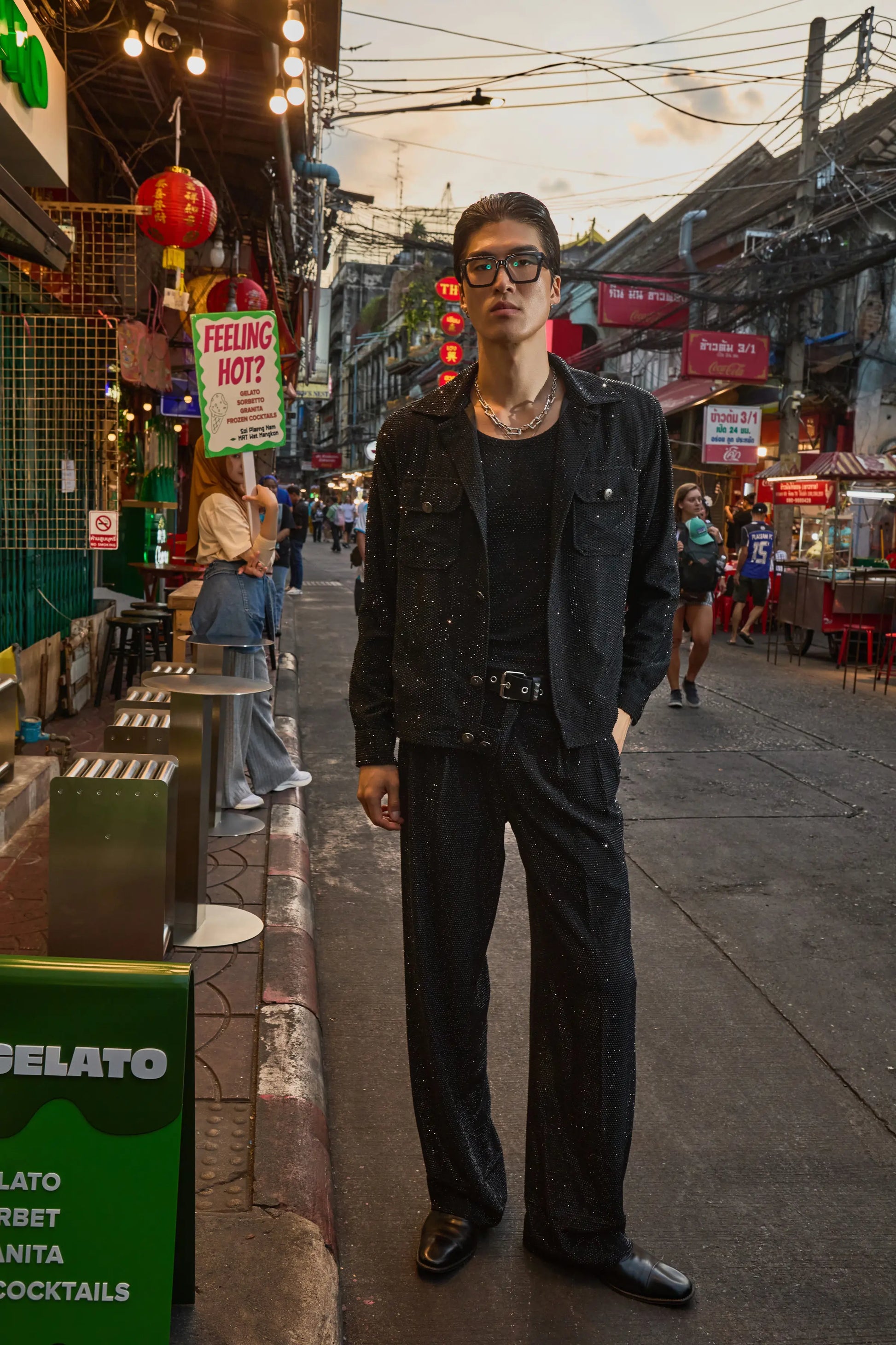 Color: Black Bomber jacket with Black crystal trousers and tank
