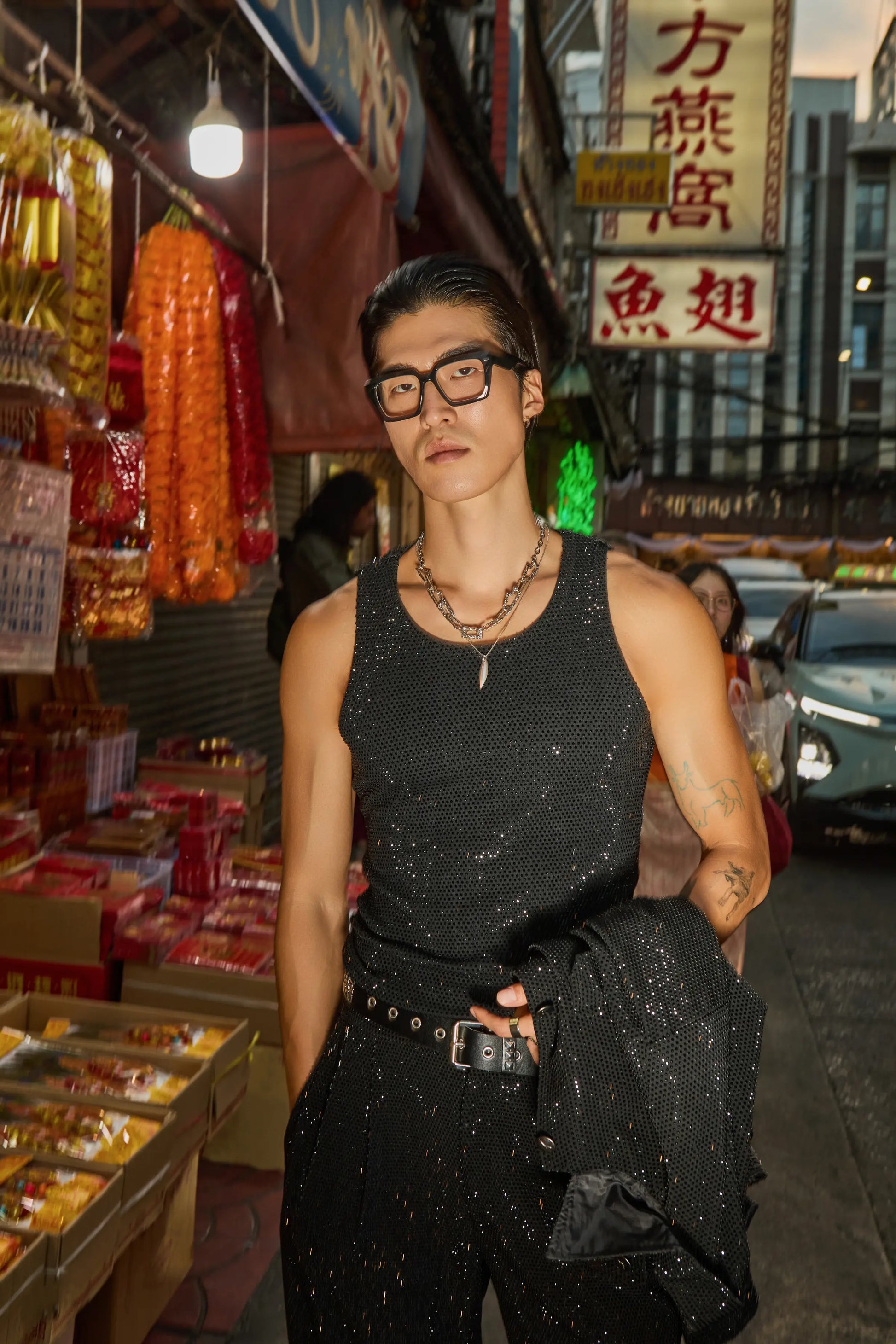 This set includes a black bomber jacket in melon crepe, a black ribbed tank top, and black crystal embellished trousers.