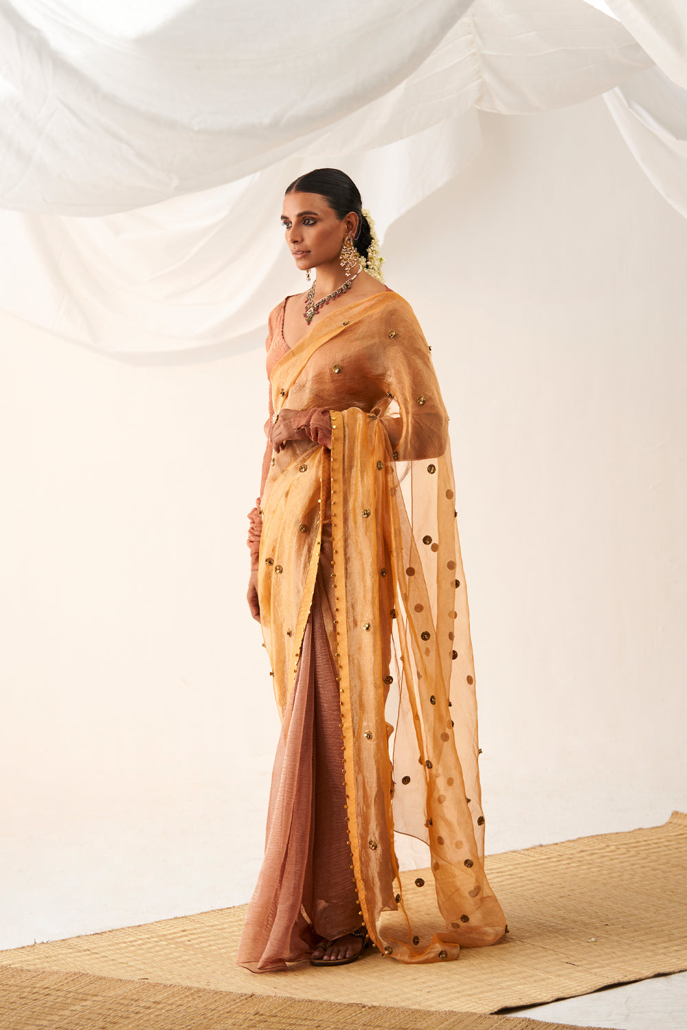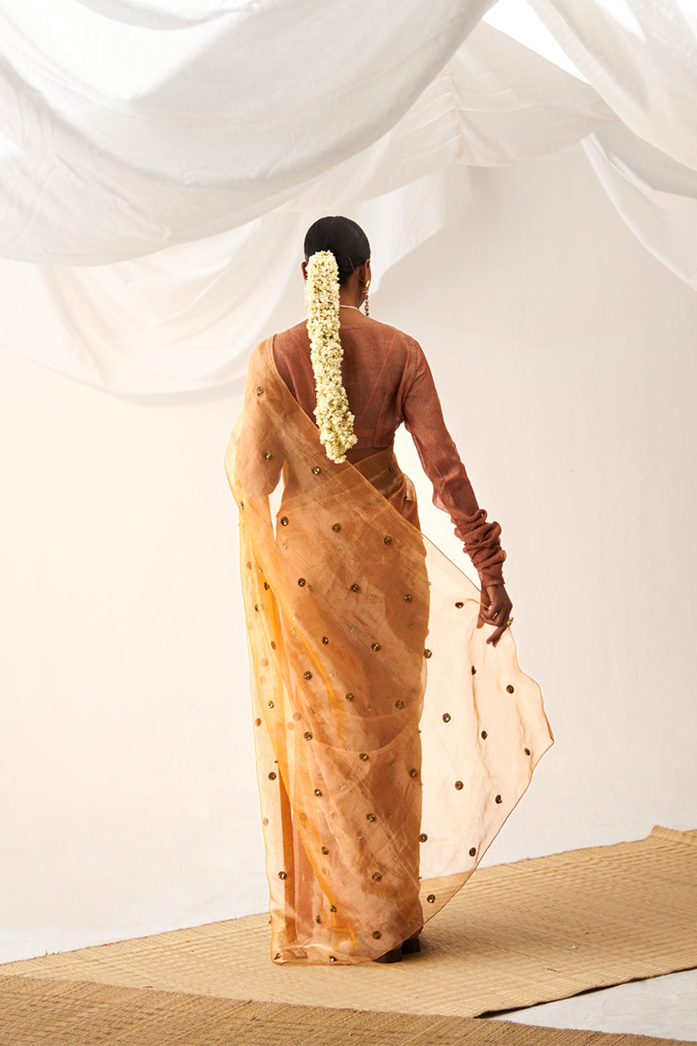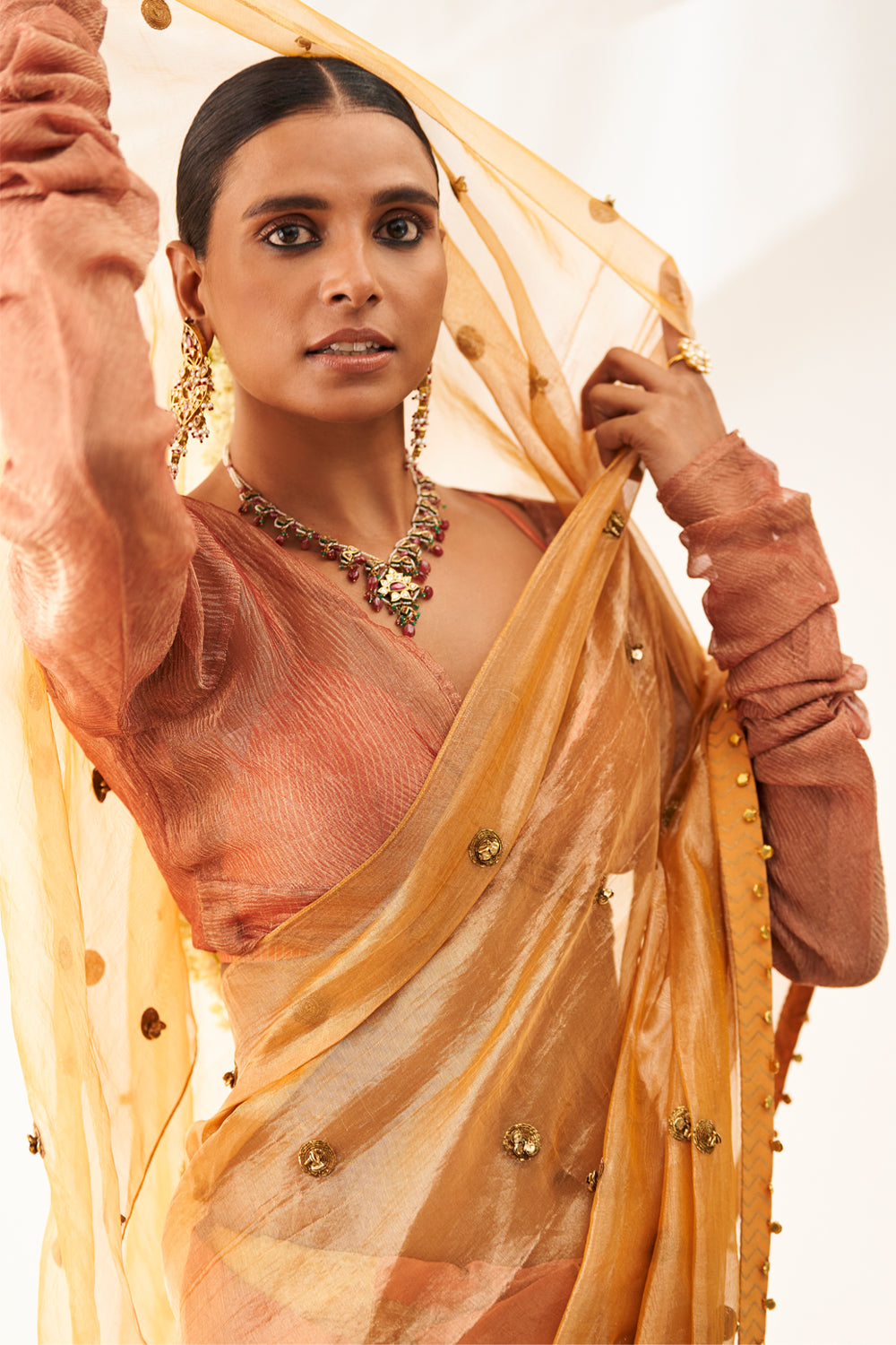 Churi sleeves knot top paired with regular saree which has peach silk tissue palla with intricated ghunghroo work.