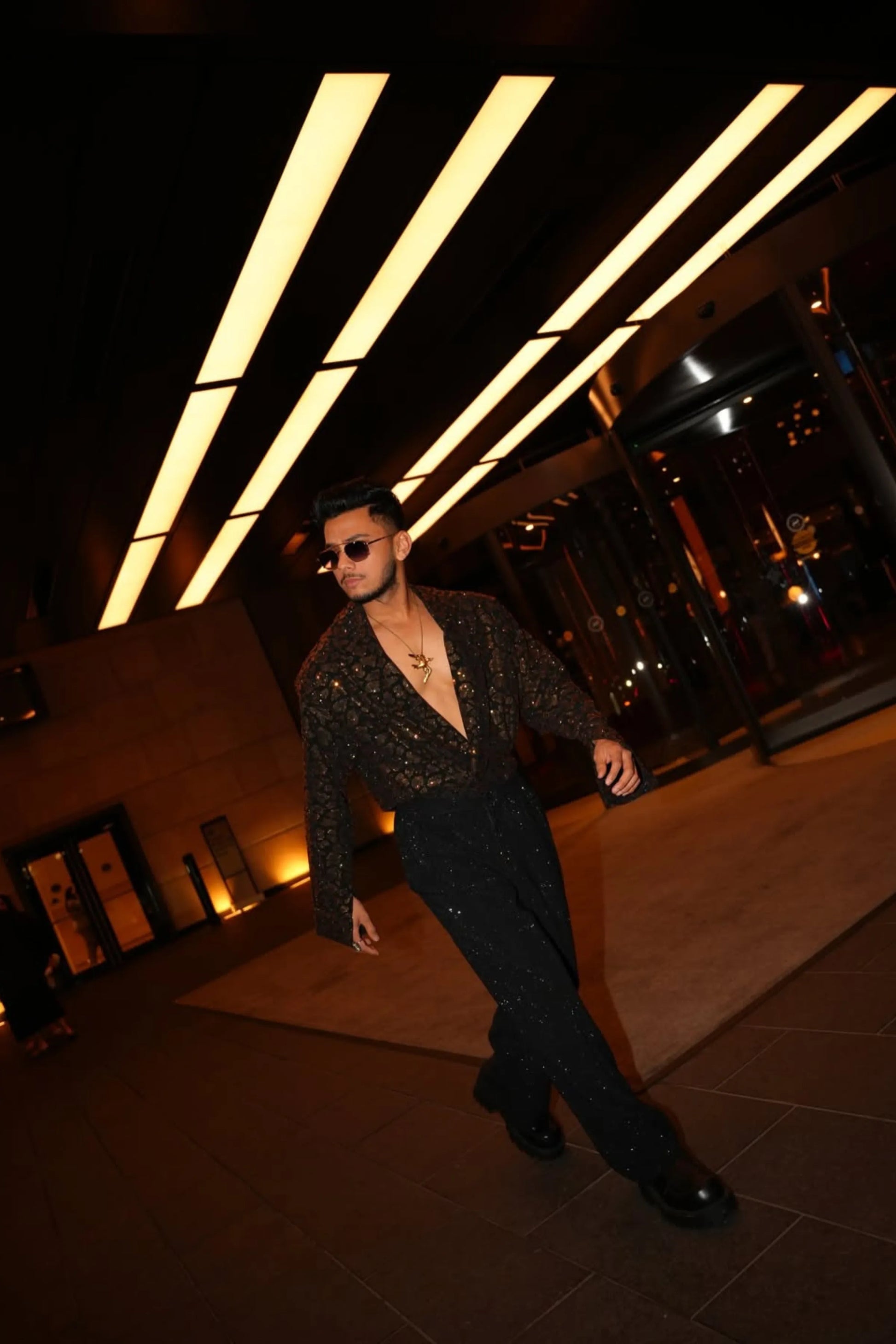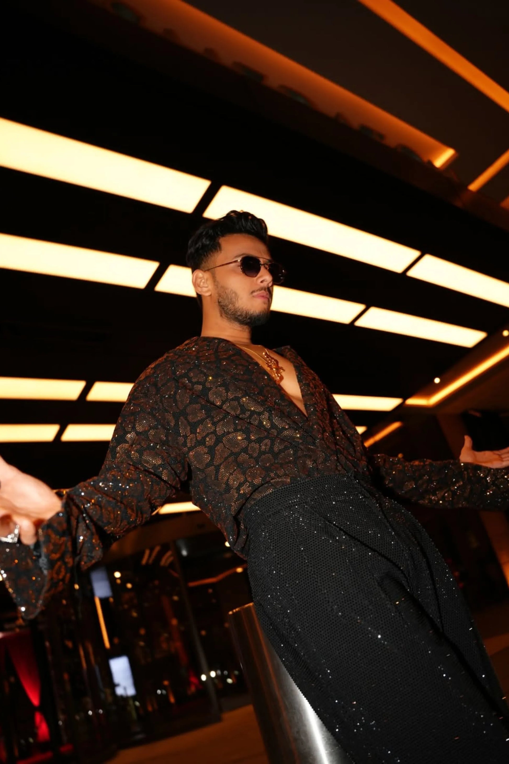 This set includes a cropped blazer in black and gold print in melon crepe and matching trousers in melon crepe.